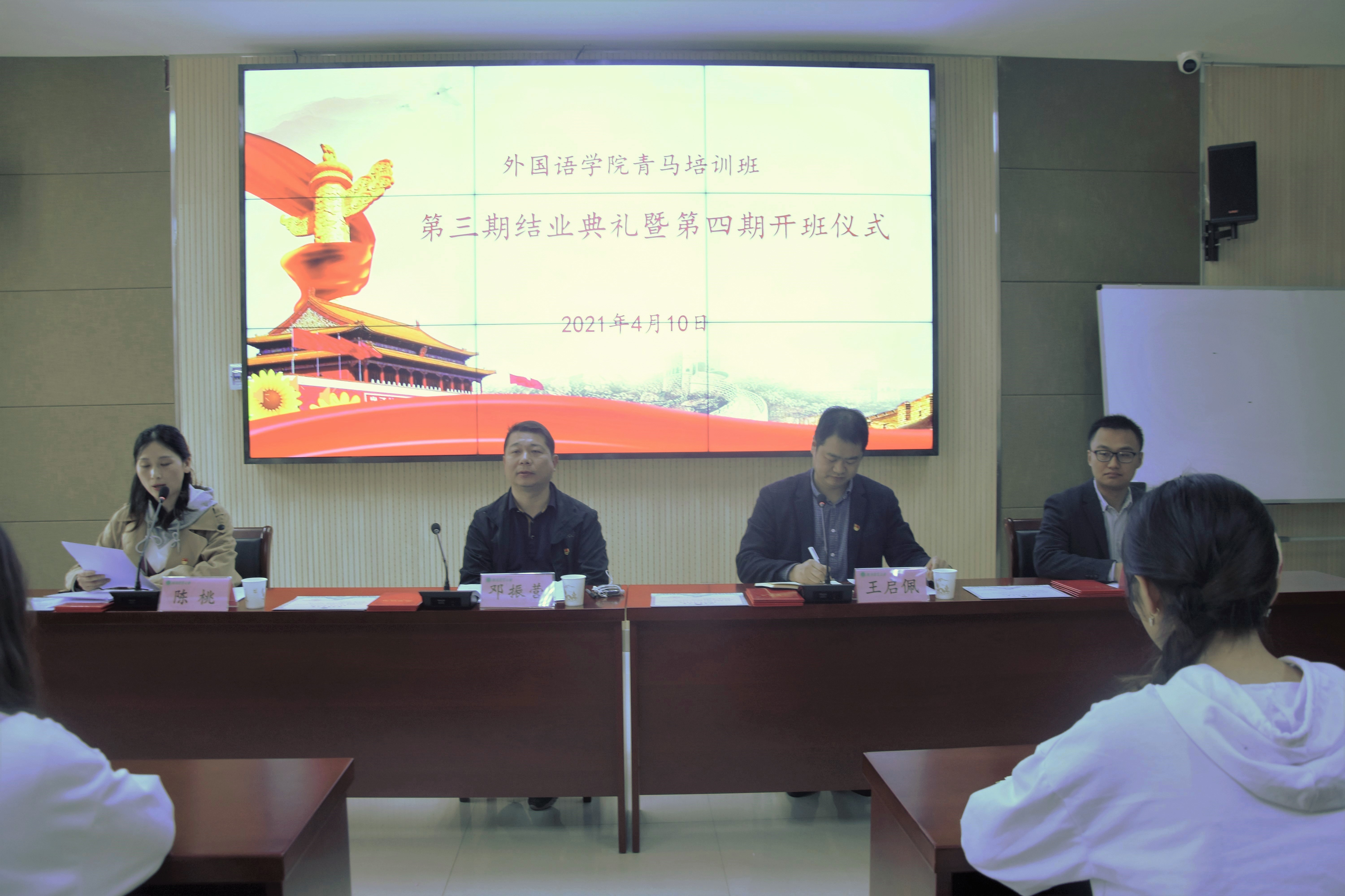仪式在庄严的国歌声中正式开始。仪式伊始,王启佩宣读了青马培训班第三期优秀学员名单并勉励同学们爱党爱国,不断提高马克思主义素养,争做新时代马克思主义的忠实信仰者、自觉践行者和坚定捍卫者;随后,院领导为第三期学员佩戴班徽并为其颁发荣誉证书、结业证书;接着,学生代表进行发言,第三期青马班班长魏慧蝶总结道,在过去一年中,一次次的理论学习和社会实践,极大地提高了同学们的同学们的思想素养和理论水平,坚定拥护马克思主义和党的主张的新时代青年;第四期新生代表景一博则表示将同新学员一起,珍惜学习机会,早日成为一名坚定的青年马克思主义者,为祖国建设添砖加瓦,为民族复兴铺路架桥。