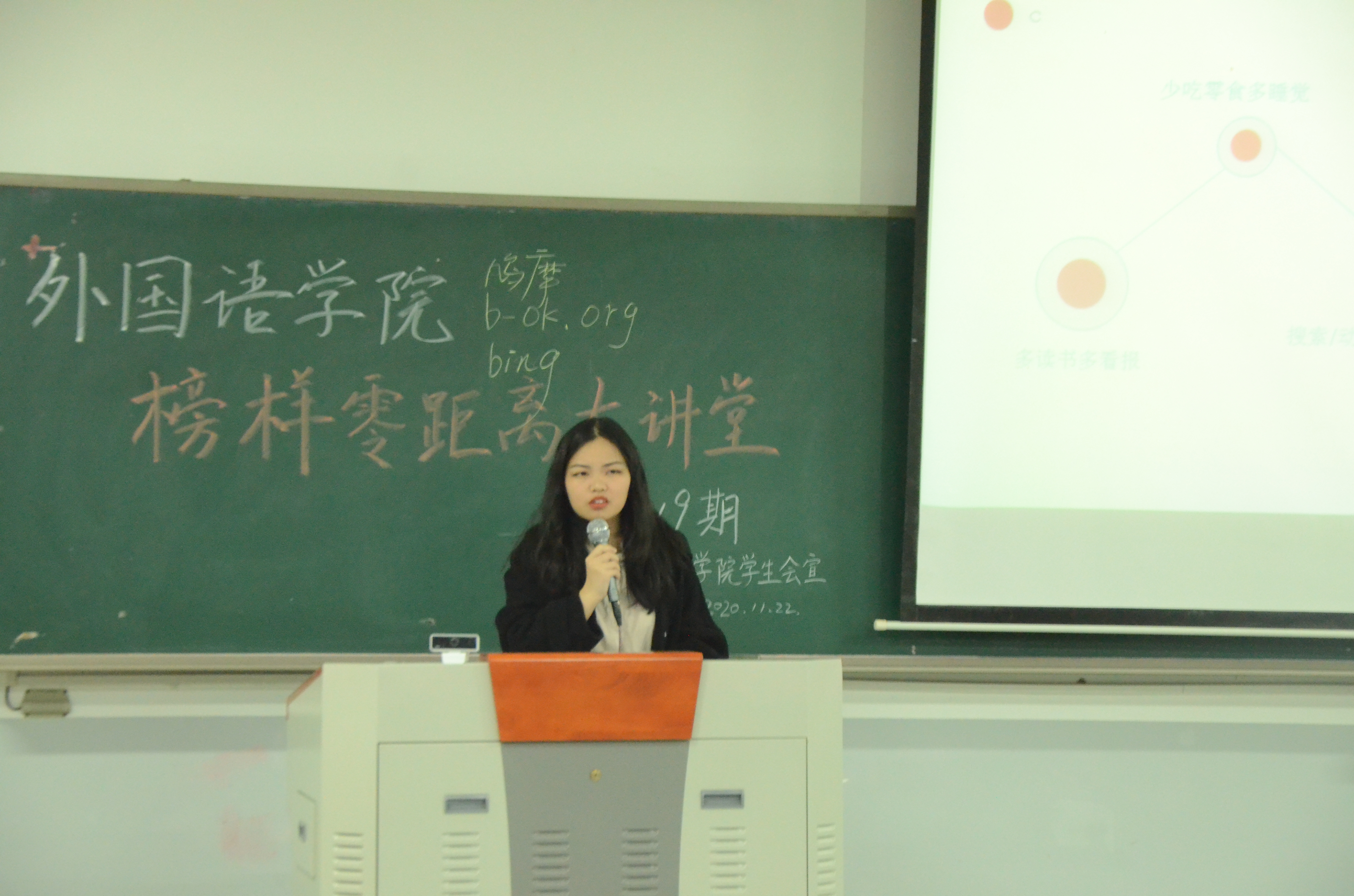 讲座中,八名优秀学生代表就学习、生活、工作等方面分享了自己的经验与方法。其中,18级英语二班张丹丹阐述了自己所获奖项与努力争取的过程,她鼓励同学们坚持兴趣爱好、树立高远目标、保持乐观心态,脚踏实地,勇敢前行;19级翻译一班杨润则向大家分享了高效的学习方法。她强调,在学习过程中,要将预习、复习与实践三者充分结合起来,做到预习常规化、复习常态化、实践具体化,这样才能在学习及工作中做到游刃有余;推免生17级英语三班宋思雨结合自身经验向在场同学介绍了专业需考证书以及相关备考经验。她指出,方法理论因人而异,我们应该做到不盲从,多探索,这样才能找到适合自己的学习和生活方式。另外,她还呼吁同学们多参与社会实践,多阅读课外书籍,以此扩大自身知识面,提高自身能力。