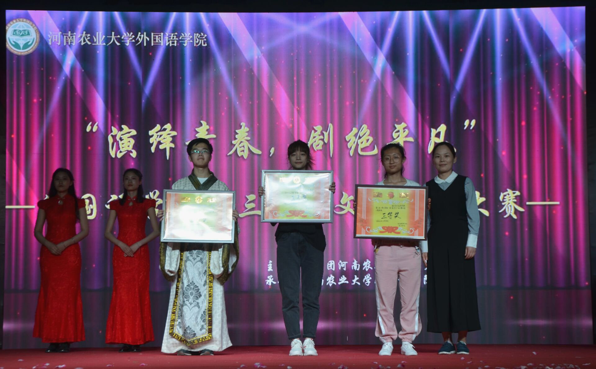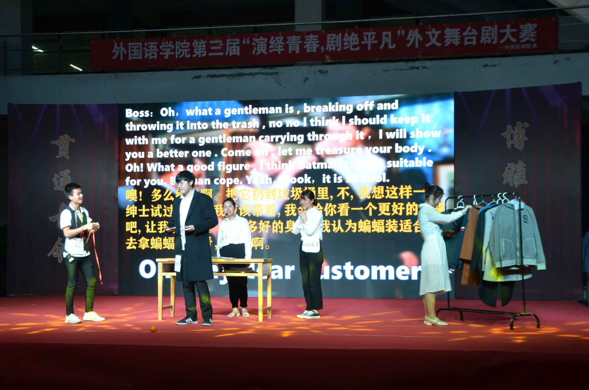 本网讯(审稿:王颖 供稿:陈晓寒)为庆祝新中国成立七十周年,弘爱国之心、立青春之志,提高口语表达能力,我院于2019年5月10日晚上六点半在龙子湖校区一餐厅广场举办外文舞台剧大赛决赛。校党委副书记、工会主席李成吾、院关工委常务副主任吴海峰、校团委书记马菲等出席比赛,张莉、杨华、刘靖宇、刘佳、聂宝玉担任评委。学院领导班子携师生代表观看了比赛。