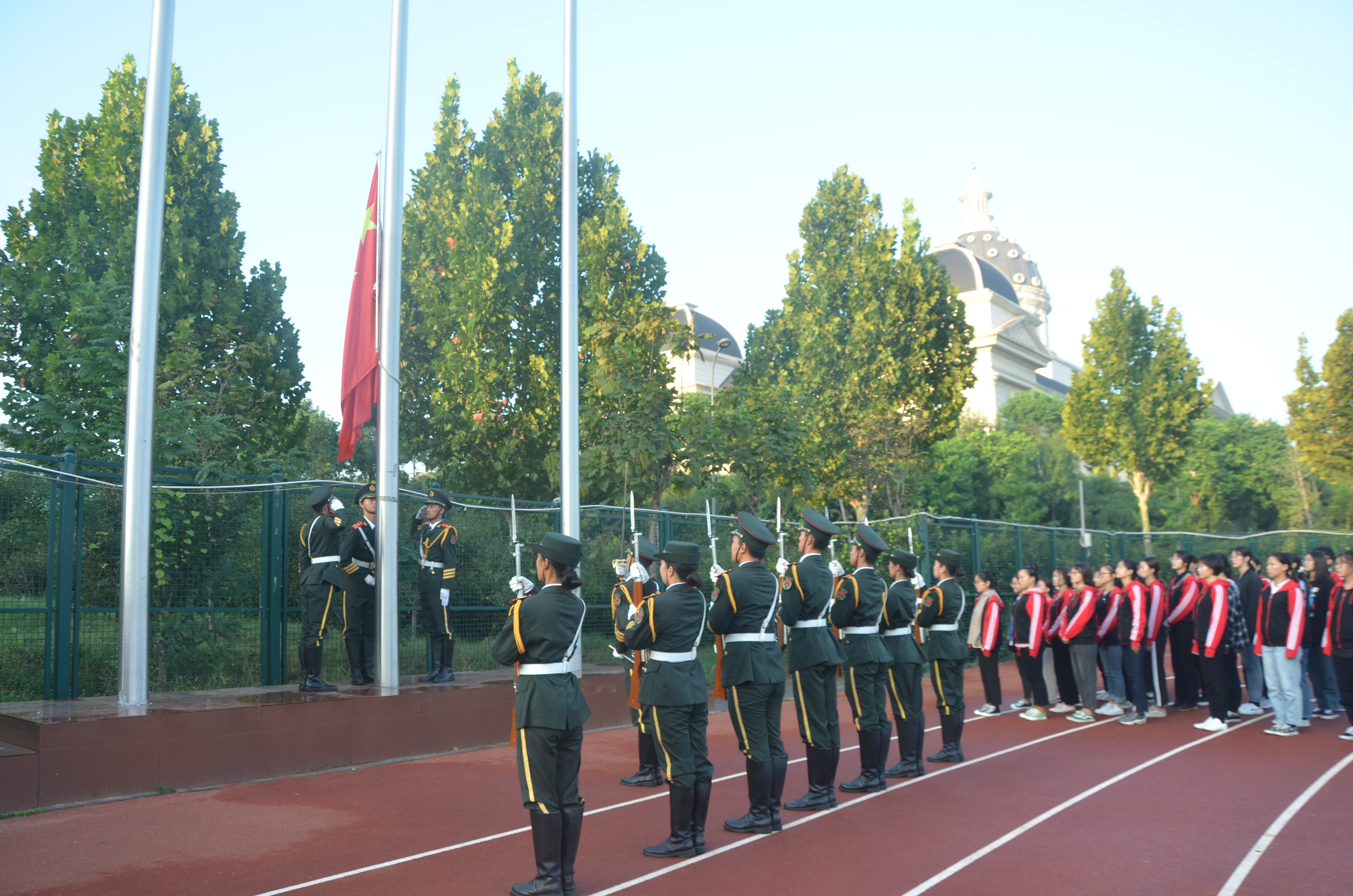 本网讯(审稿:李沛 供稿:梅如意)在“九一八”事变88周年来临之际,为增强学生的爱国情怀,使学生“牢记历史,不忘国耻”,2019年9月18日东方破晓之际,我院学生在龙子湖校区田径场举行升旗仪式。