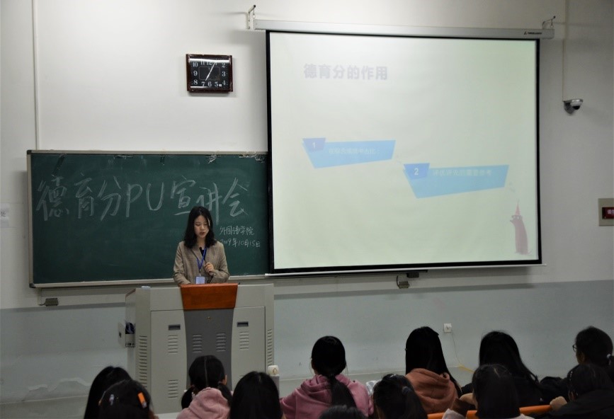 本网讯(审稿:李沛 供稿:梅如意)为进一步落实“第二课堂”成绩单制度,使2019级学生熟练使用“PU口袋校园”,调动其自主参与活动的积极性,10月15日晚七点,学院于龙子湖校区繁塔楼C402、C404教室举办第二课堂培训及德育分细则宣讲活动。2019级全体学生参与了此次活动。