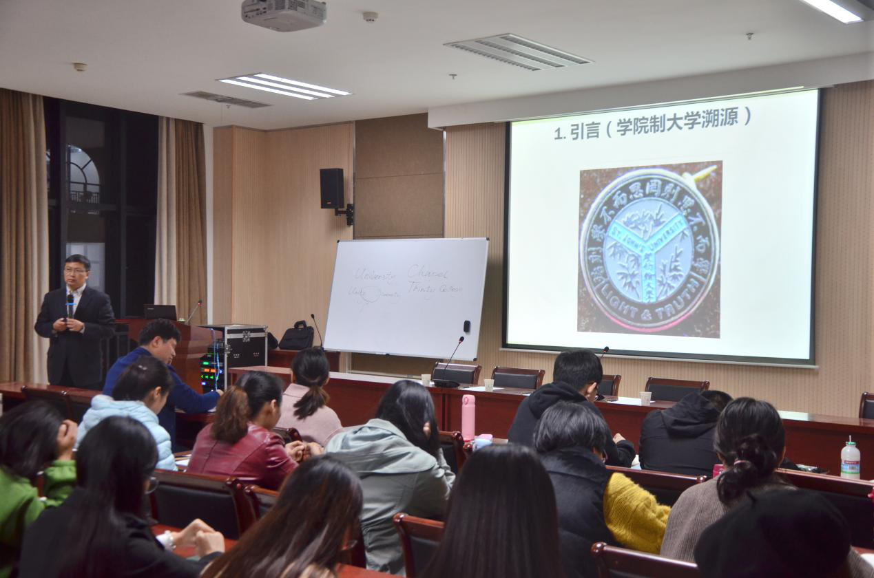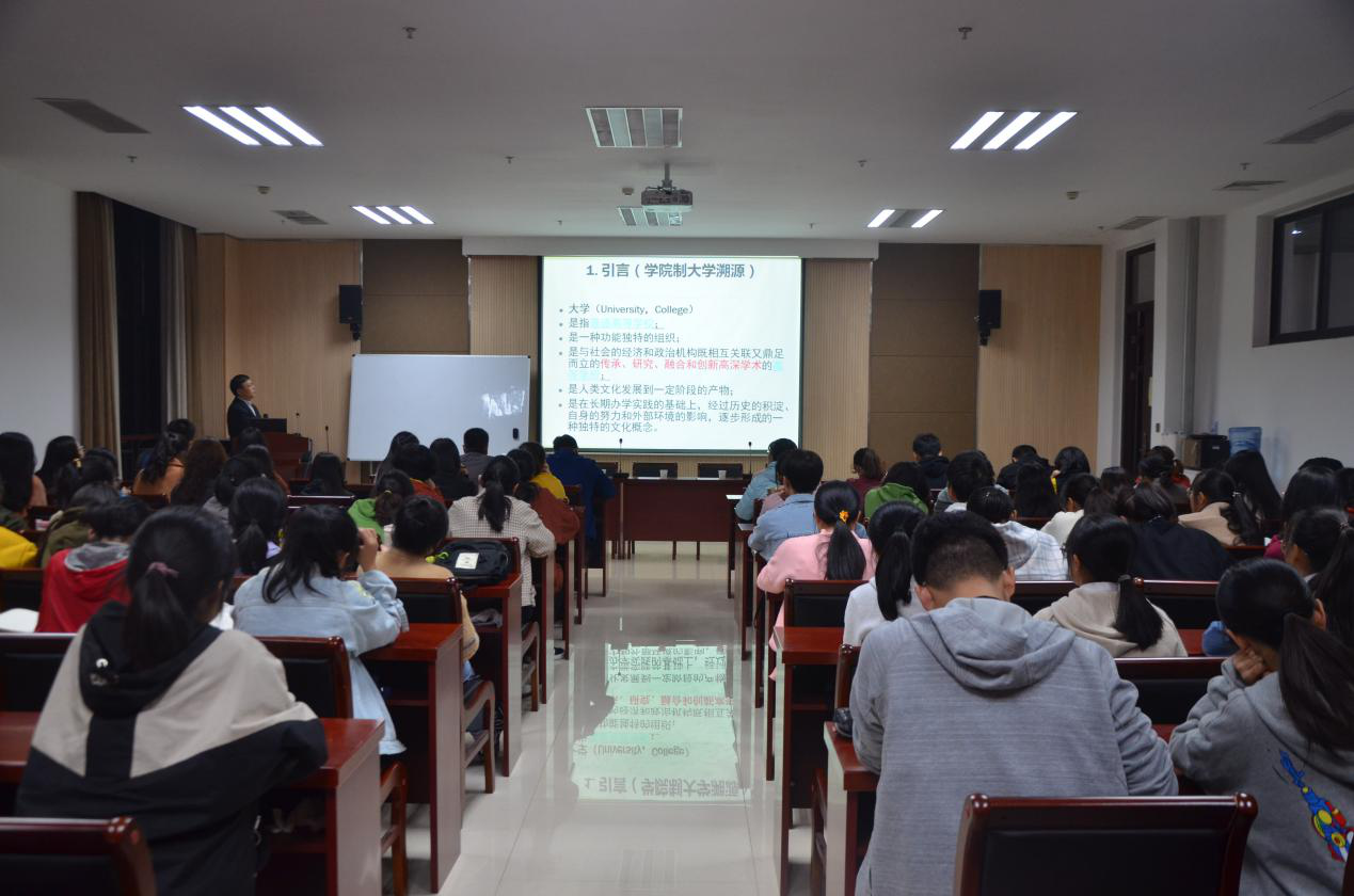 本次讲座以“学院制大学”、“人才培养模式”、“剑桥大学”为关键词展开。首先,张俊杰教授以当今中外大学教育的差异引入,并简要介绍了英国学院制的声望和成果。张俊杰教授追根溯源,从大学之本、大学的使命、中国对现代大学制度的建设和探索、何为学院制大学四个方面进行了详细解说。他用“Universe”、“Unity”、“Diversity”三个单词巧妙地解释出了大学的本义,即传承、研究、融合和创新高深学术的高等学府,并以此明确了大学培养人才的原则、目标和使命,即培养有高尚品格、有教养的学生。他还通过举例,具体解释了何为学院制大学,并细致阐述了学院制与现代大学制度的区别。接着,张俊杰教授进一步深入,从“院校职能分离、导师制、探究式教学”三个方面具体分析英国学院制的人才培养模式,并结合自身访学经历,指出了导师制与探究式教学值得学习与借鉴之处。最后,张俊杰教授向大家展示了英国剑桥大学等国外名校的照片,深化了学生对国外名校的认识与了解,极大的激发了学生对国外名校的憧憬与向往,促使其坚定努力学习、奋发向上的信念。