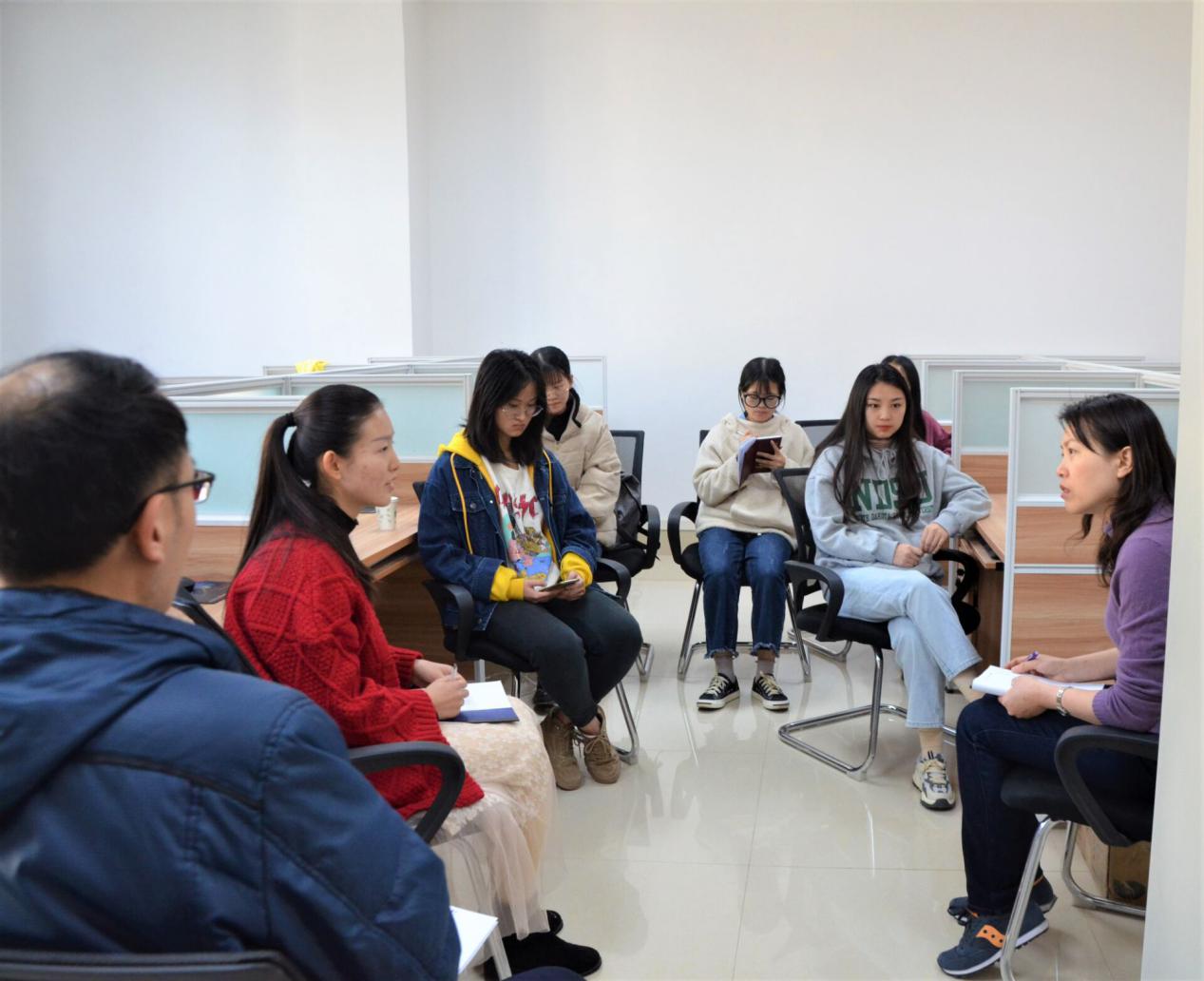 座谈会在轻松而热烈的氛围下进行,各班学委轮流发言、各抒己见,就本学期的学院教学管理、教师授课情况、学风状况等方面的问题一一反应出来,参会老师对所提出问题认真做好记录并进行解答。期间,针对学生课堂积极性不高、老师教课节奏过快、师生间互动过少等课堂问题,张俊杰指出要加强学生各方面的独立能力,学会自主学习,同时学委要充分发挥作用,调动班内同学学习积极性并及时与任课老师交流协商,找到更适合班级的教学方法。针对教材设计不合理、学生上大课时抢坐后排等问题,宋扬表示会对教材的选择进行斟酌并合理调节大小班的上课机制,同时建议学生上课轮流回答问题,以此提高课堂活跃度。最后,座谈会在轻松愉快的氛围中圆满画上了句号。