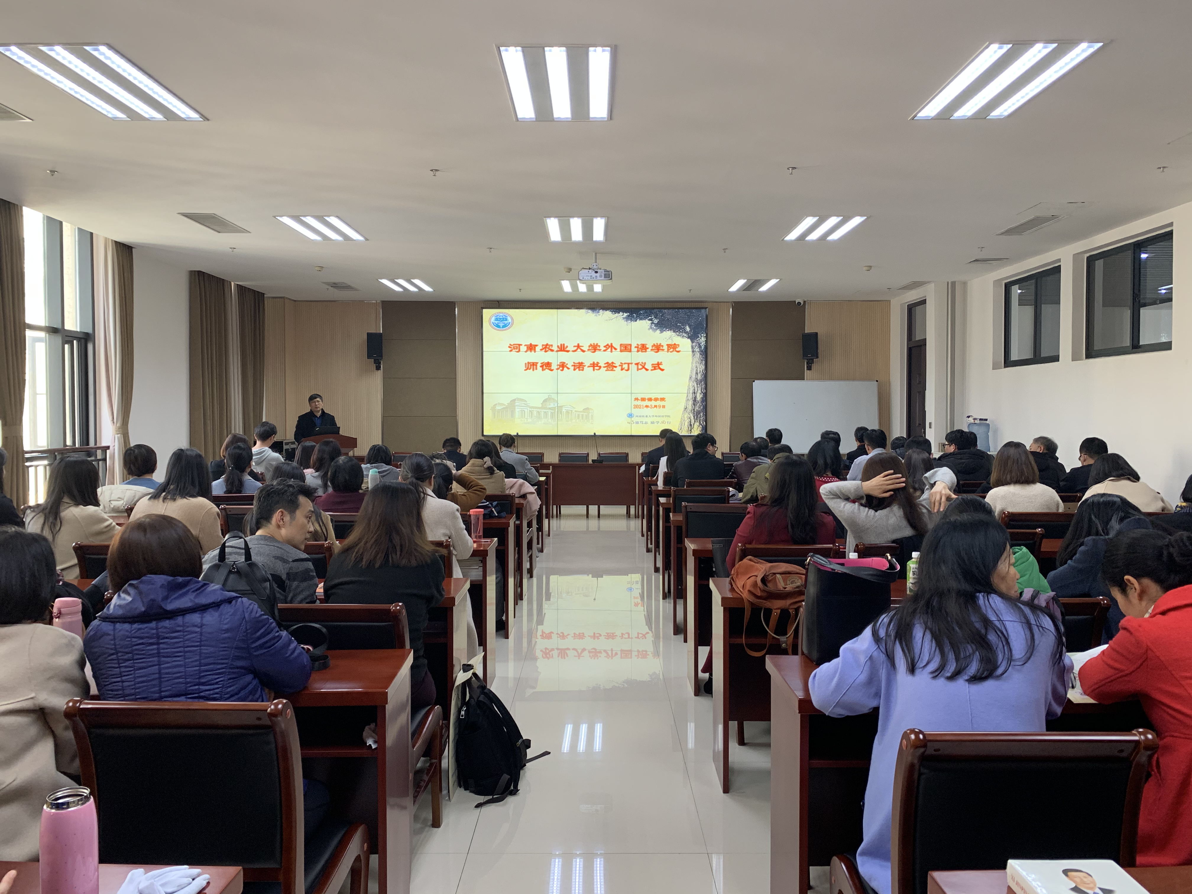 3月9日下午,全体教师,衣着整洁,仪表端庄地走进会场。党委副书记王启佩主持本次活动,院长张俊杰做了题为《筑牢师德师风建设底线,勇担立德树人新使命》的专题报告,教师代表做了交流发言,全体教师在隆重的氛围中庄严签订了《纵横中文网 师德承诺书》。