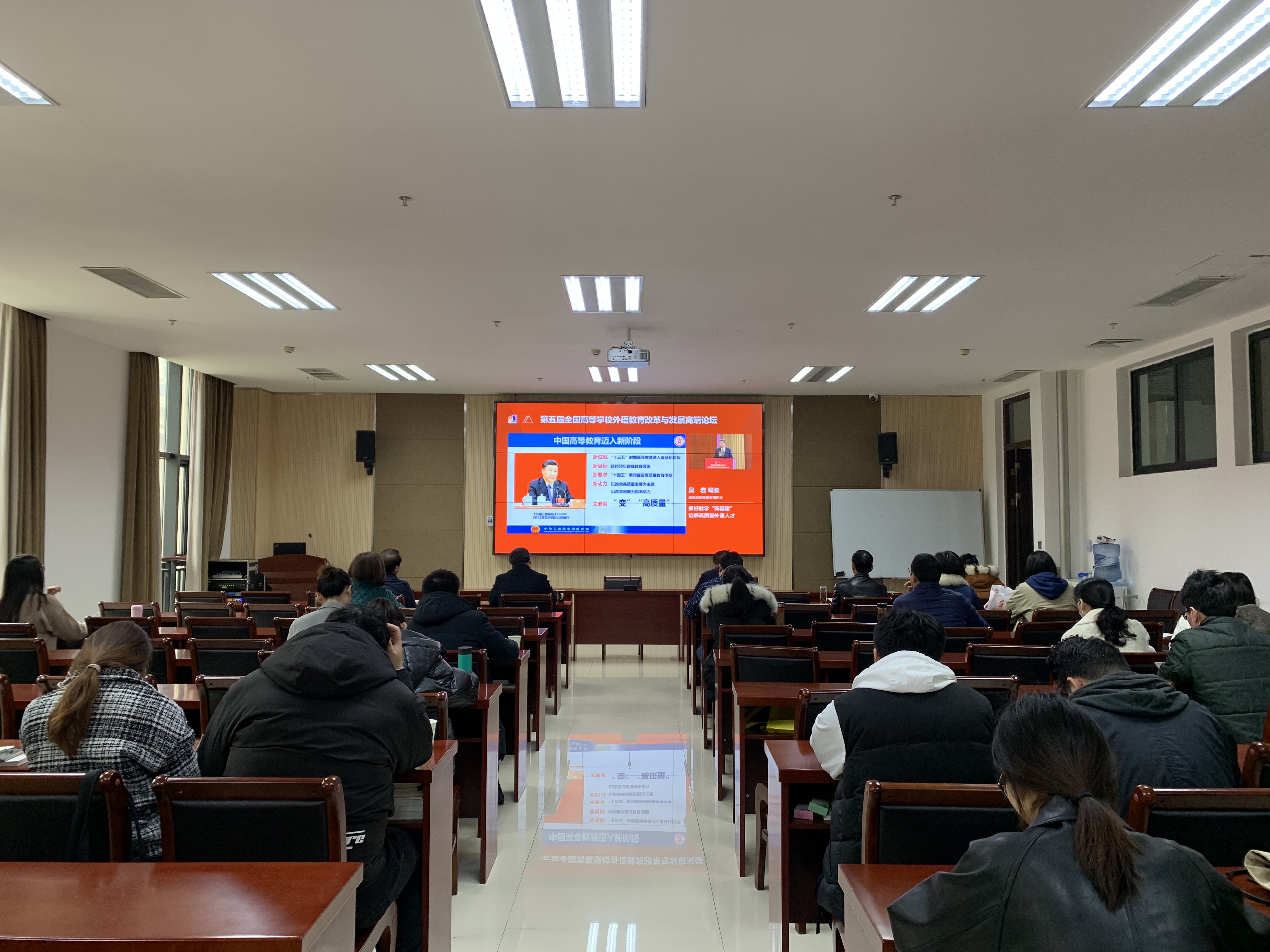 本网讯(审稿:陈桃 供稿:王莉)第五届全国高等学校外语教育改革与发展高端论坛于3月20至21日召开。为探索外语教育创新发展,铺就铸魂育人新格局。 院领导班子带领全院师生于龙子湖校区繁塔楼A324会议室,以线上观看论坛直播的形式参与本次论坛。