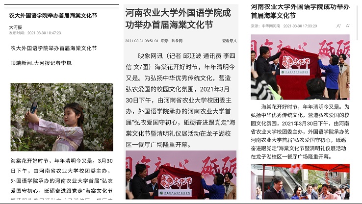 首届海棠文化节暨清明礼仪展于龙子湖校区一餐厅广场隆重开幕。本届海棠文化节以“弘农爱国守初心,砥砺奋进跟党走”为主题,旨在通过颂海棠、展礼仪、思乡情、念党恩、忆峥嵘等活动,进一步弘扬中华优秀传统文化,学习伟大的脱贫攻坚精神,传承红色基因,厚植家国情怀,向建党100周年献礼!活动现场气氛热烈,营造了浓郁的弘农爱国氛围,充分彰显了农大学子昂扬向上的精神风貌。