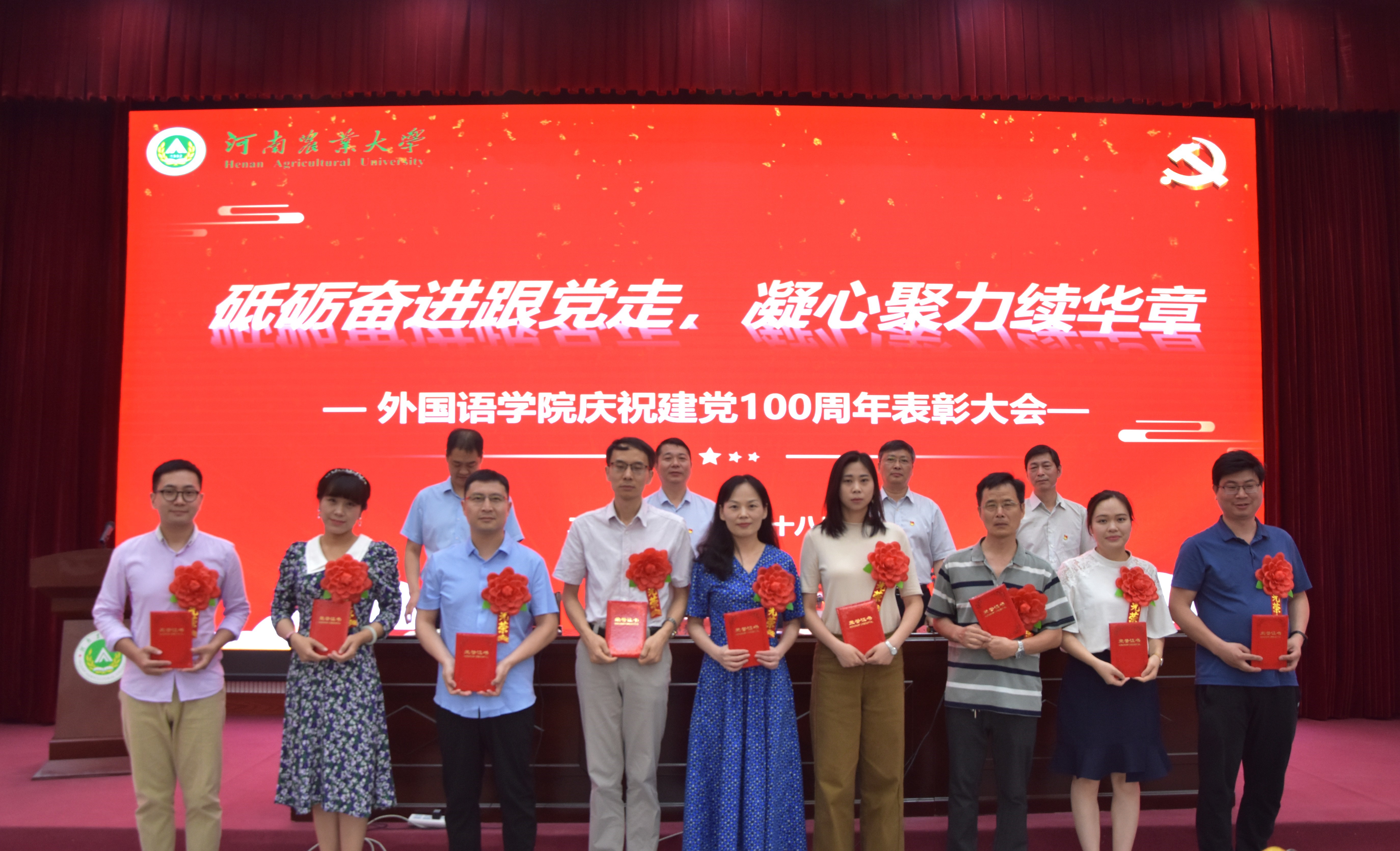 关于表彰2021年度先进集体和先进个人的决定》。在热烈的气氛中,院领导为受到表彰的先进集体和个人颁奖,向受表彰的师生表示衷心的祝贺,并肯定和赞扬了他们在工作和学习中的优异表现。随后,“优秀共产党员”教师代表余亮、“最美教师”代表柴奇、“优秀班主任”代表张建宇及“三好学生”代表18级日语二班张引倩分别发言,他们表示今后将再接再厉、立足本职、积极进取,共筑学院的新辉煌。接着,院党委书记邓振营带领全体党员们面对党旗庄严宣誓。