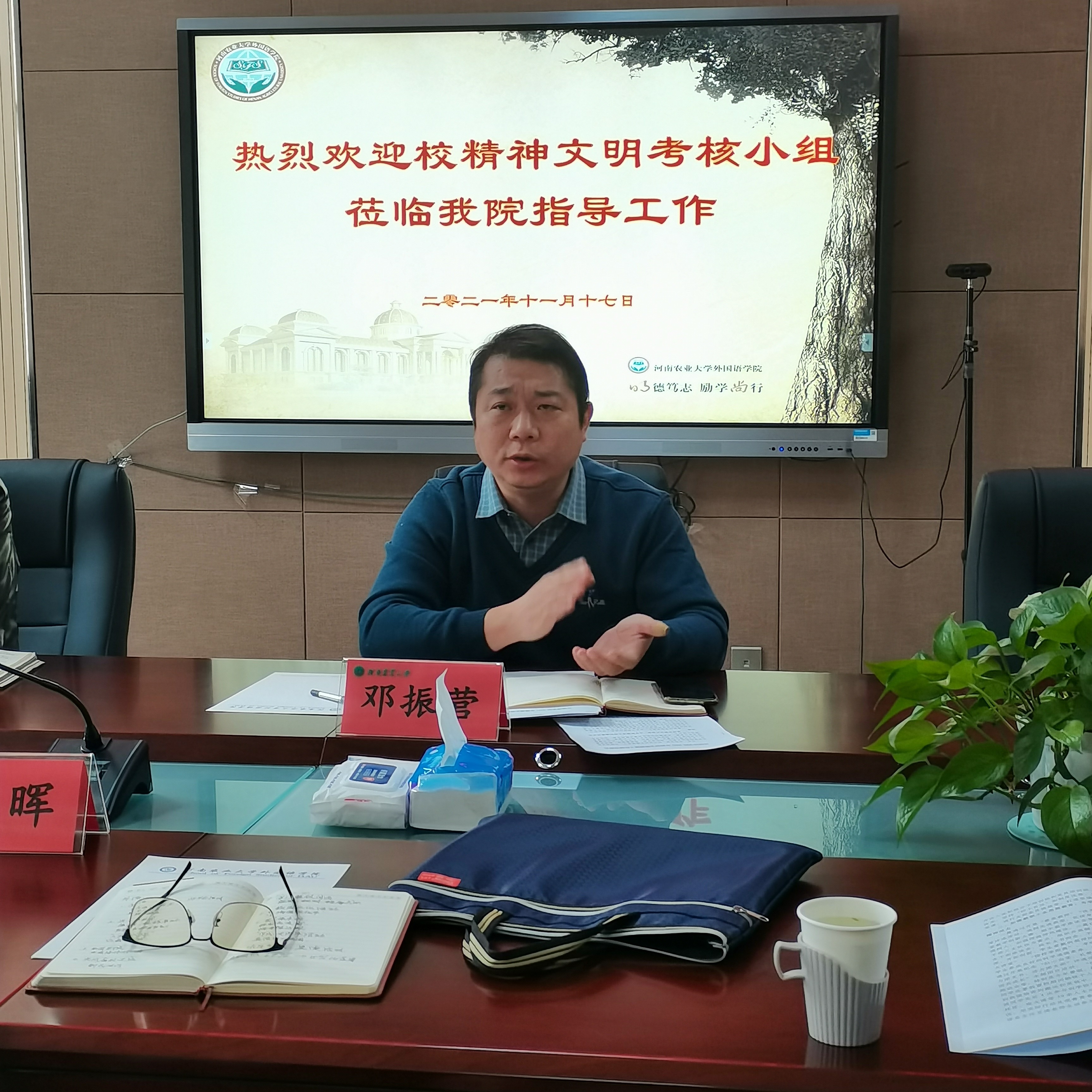 为全面贯彻落实习近平新时代中国特色社会主义思想和党的十九届六中全会精神,扎实推进精神文明建设,11月17日,校精神文明考核小组组织部副部长冯晖和林学院党委副书记李兴旺莅临学院,检查指导精神文明建设工作。