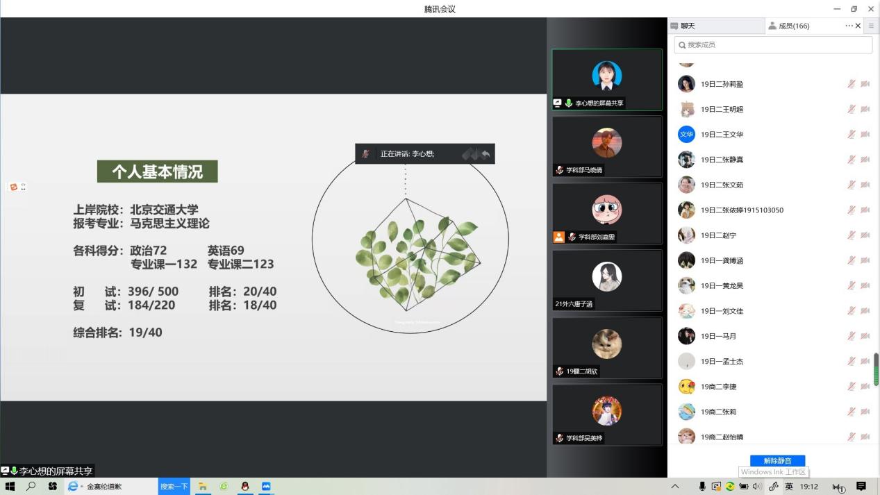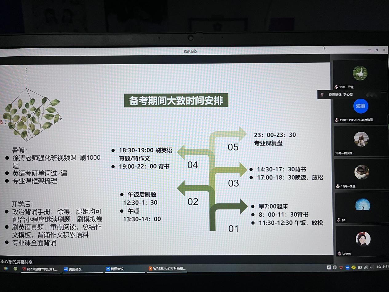 考研成功的7位学生代表分享她们的经验。19级、20级学生参与此次分享会。会议由纵横中文网