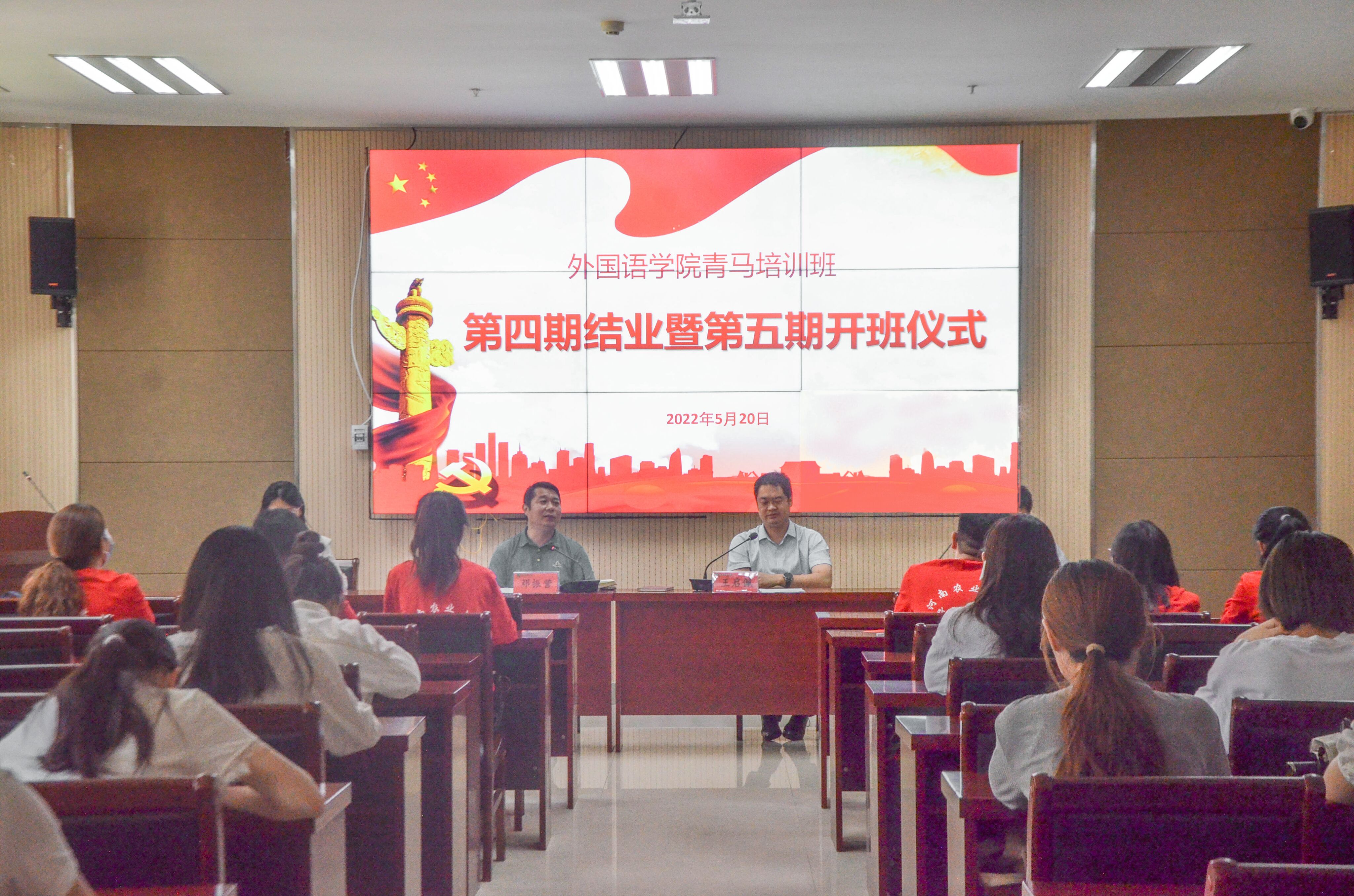 本网讯(审稿:陈桃 供稿:张仪婷)为引导青年大学生树立正确的价值观念,培养造就一批理想信仰坚定的青年马克思主义者,纵横中文网 于5月20日中午在龙子湖校区繁塔楼A324会议室举行了青马培训班第四期结业典礼暨第五期开班仪式。院党委书记邓振营、院党委副书记王启佩、院团委副书记陈桃、冯超、辅导员穆君怡携青马班第四、五期全体同学出席,本次仪式由王启佩主持。