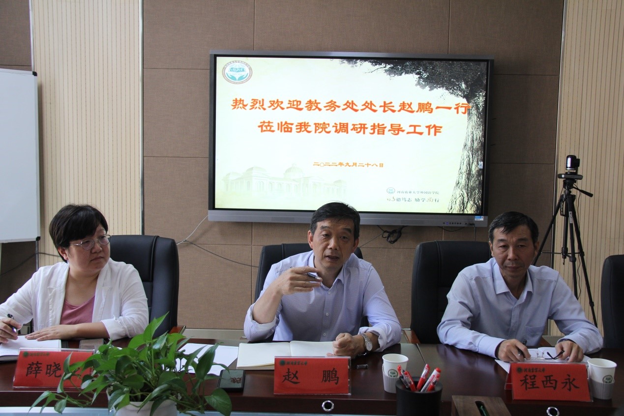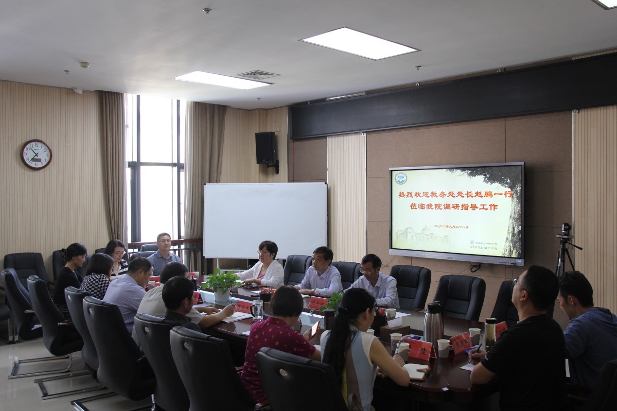 (通讯员 李萌 图片 黄彪)9月28日上午,教务处处长赵鹏,副处长程西永、薛晓亚一行到我院调研指导教育教学工作。学院院长张俊杰、党委副书记王启佩、副院长张卫东、教学督导及各系部、室负责人参加座谈会。张俊杰主持会议。