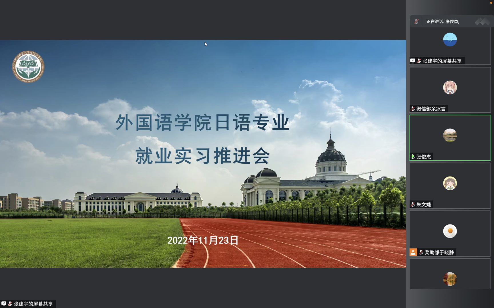 词源教育公司、猿辅导教育培训机构负责人分别对公司的部门构成、日常工作、薪资福利以及招聘要求进行详细介绍,鼓励毕业生前去实习;日语系主任邱丽君围绕教学计划、实习安排、实习目的和意义等内容为毕业生做规划指导;辅导员冯超从就业形势、就业政策以及就业手续办理等方面为毕业生做就业指导。期间,同学积极互动,反响热烈。