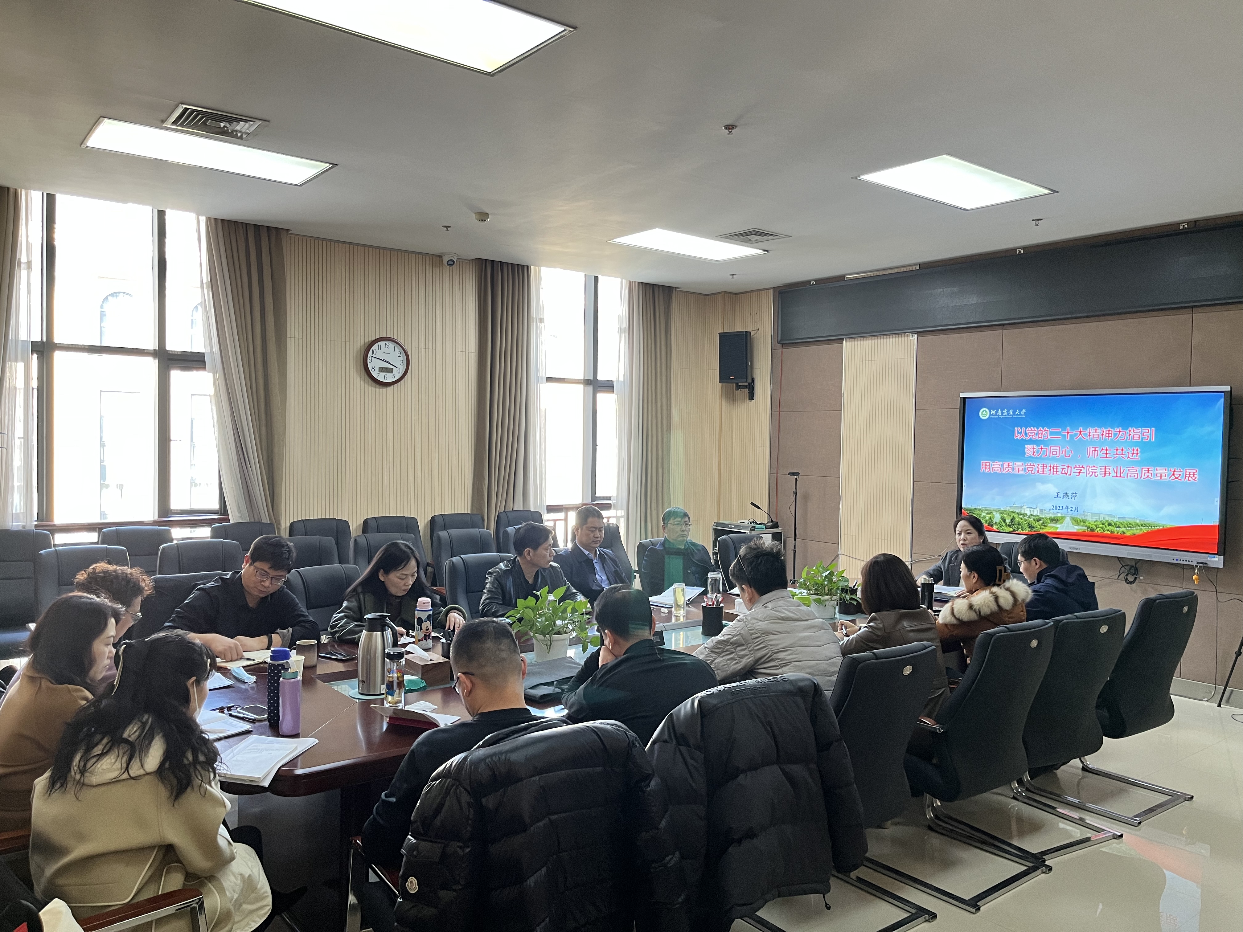 院党委书记王燕萍以“以党的二十大精神为指引,戮力同心,师生共进,用高质量党建推动学院事业高质量发展”为题做辅导报告,重温了党的二十大报告中“关于教育,关于干部,关于青年”的最新指示精神,强调了党员、领导、干部应该时刻牢记自己的身份,提出了“讲学习比才干,讲担当比忠诚,讲奉献比业绩”的要求,分享了一套干好工作的方法。随后,与会人员结合自己的工作,进行了研讨。
