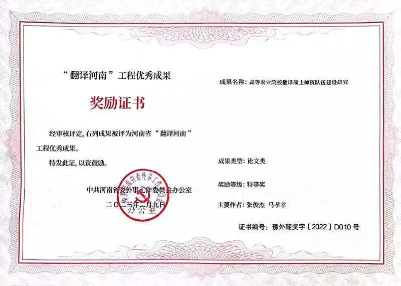 “翻译河南”工程由中共河南省委外事工作委员会办公室发起,旨在适应新时代对外开放形势对翻译工作的新要求,讲好河南故事,服务我省“三区一群建设”,助推我省深度参与“一带一路”国际合作。优秀成果征集活动开展以来,我院及时传达部署,广泛宣传动员,认真组织申报。以张俊杰院长为代表的9名老师积极参与申报,最终喜获佳绩。