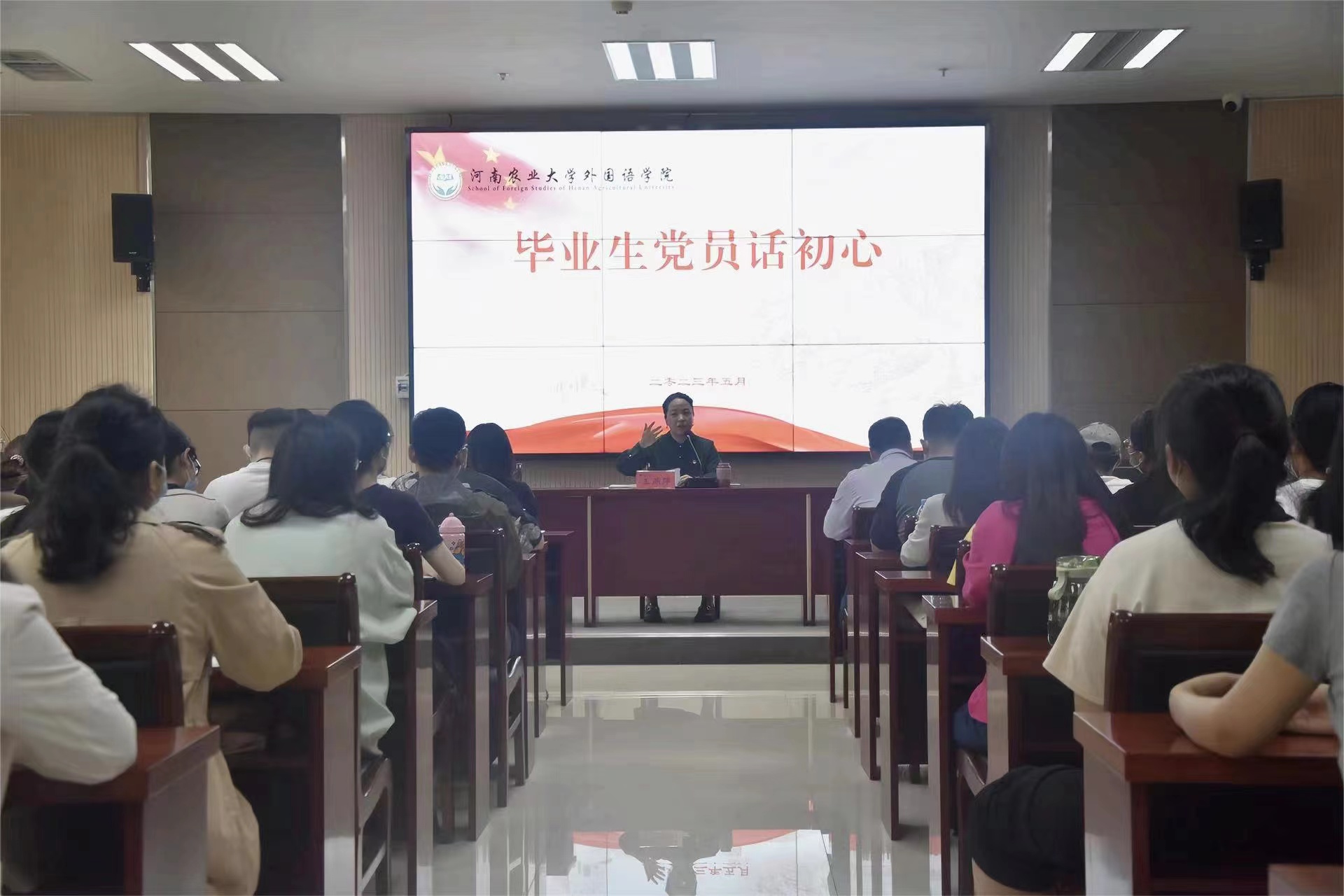 王燕萍对大家在攻关克难、专业学习、服务师生、奉献社会等过程中展现出的良好青春风貌表示赞赏,她结合自身体会,将党的嘱托、人生经历与心得体悟向同学们娓娓道来,鼓励毕业生党员践行初心使命、矢志不懈奋斗、锤炼过硬本领、永葆政治本色,打下更高质量的基本功,塑造更加卓越的竞争力,胸怀更有梦想的大格局,努力成为实现中华民族伟大复兴、构建人类命运共同体的新型农林外语人才,并祝愿毕业生们前程似锦,高歌猛进,一帆风顺,事事如意!
