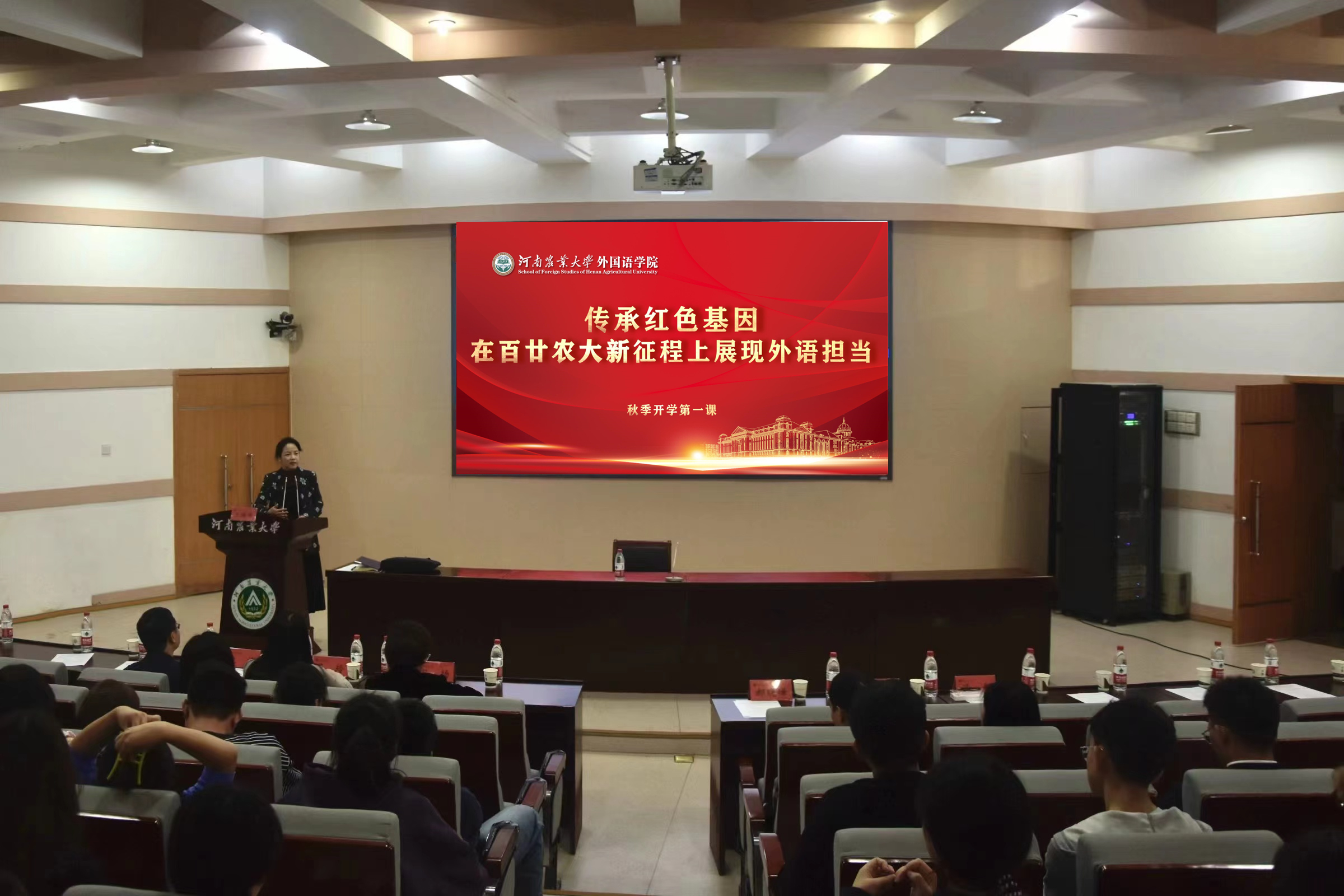 王燕萍发表讲话,并以“传承红色基因 在百廿农大新征程上展现外语担当”为主题以给全体同学上开学第一课,她向同学们讲述了学校121年的光辉历史及吴绍骙、王泽霖、郭天财、秦英林四位农大人的故事,激励同学们修业求真、开阔心智、涵养能力,为青春远航积蓄力量,同时从尽快融入大学生活、养成良好的自律习惯、努力提升自己的能力、善于展示自己的才华等八个方面强调如何成为一名高质量大学生,并寄语同学们要感恩时代、感恩相遇、感恩自己,成为有理想、敢担当、能吃苦、肯奋斗的新时代好青年。