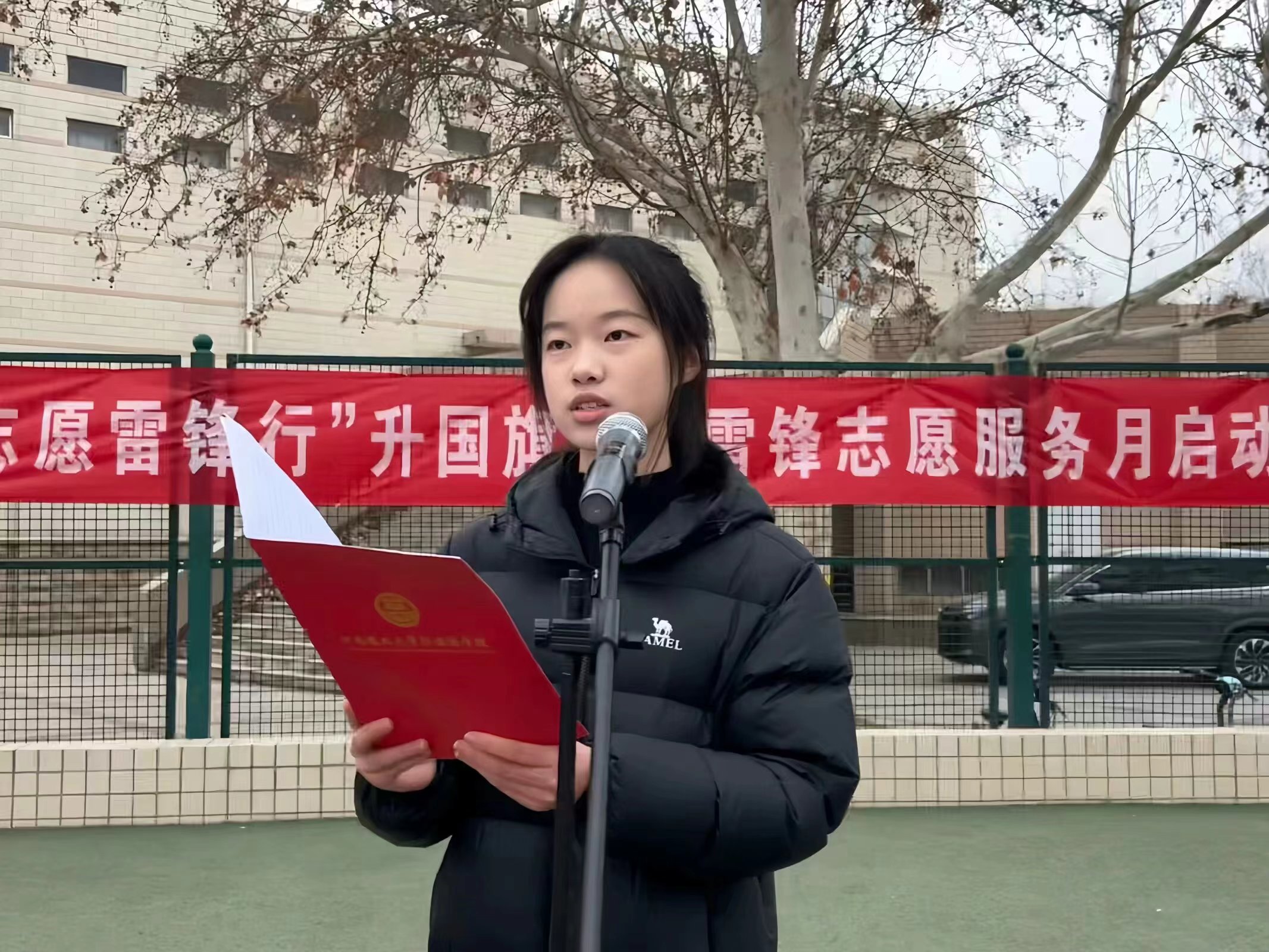 2023级学生代表朱江进行国旗下的演讲。2023级助班代表和学生代表朗诵了《雷锋》,表达了要将雷锋精神传承下去的信心与决心。仪式结束后,现场师生有序在条幅上签名,为学雷锋志愿服务月开启崭新篇章。