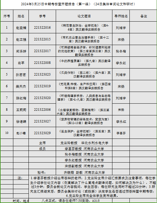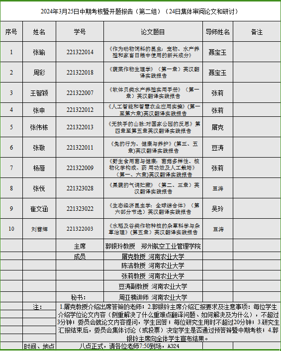会议开始,张俊杰教授、屠克教授、李喜芬教授介绍委员会成员及参与答辩的老师。随后答辩委员会主席党兰玲教授、孙建华教授与郭银铃教授分别就本次答辩环节及答辩流程进行了详细的介绍。随后,29名研究生就入学以来学习情况、思想政治情况以及学位论文完成情况采用PPT依次进行汇报。每名研究生人汇报后,各位委员就汇报人学习、思想及论文内容进行交流。委员会委员分别指出论文或展示中存在的不足之处,引导学生做出质量更高的硕士学位论文。汇报人认真记录每位委员给予的指导性建议,表示会后会对论文进行针对性的修改。最后,委员会根据学生的学习、思想政治、论文质量及表现进行评分。
