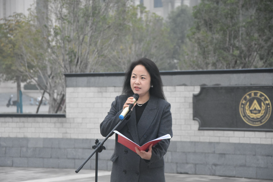 王燕萍发表国旗下的讲话。她深情回顾了新中国成立75年来、学校建校122年来和学院建院20年来的辉煌历程和发展成就,并寄语全院师生立为国奉献之志、立为民服务之志,致力于融通中外、语结四海,致力于躬身实践、知行合一,在新时代新征程上不断展现外语形象、外语实力和外语担当。