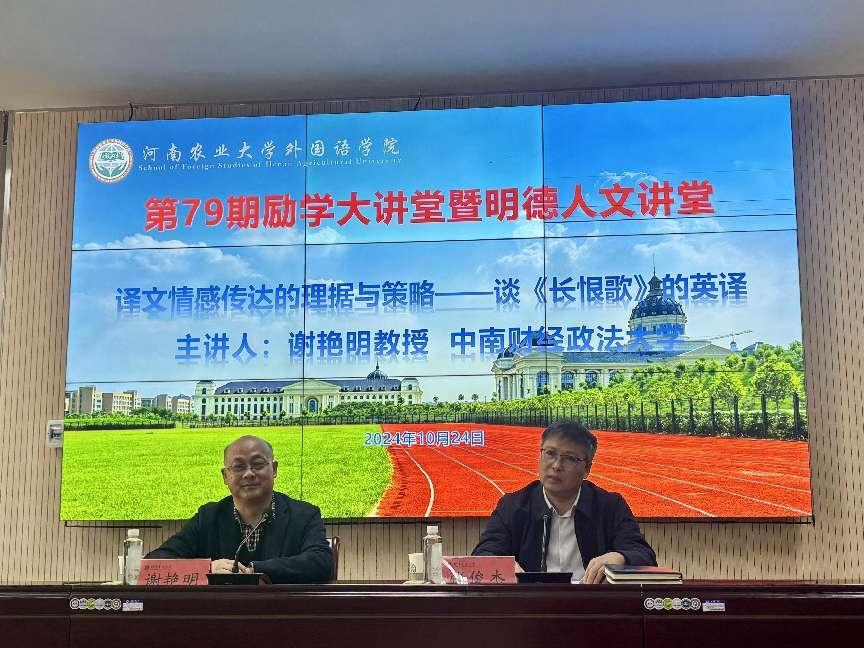 本网讯( 审稿:吴玲 供稿:马孝幸 摄影:王静岩)10月24日下午中南财经政法大学谢艳明教授应邀做客我院第79期励学大讲堂暨明德人文讲堂,做了题为“译文情感传达的理据与策略——谈《长恨歌》的英译”的报告会。报告会由院长张俊杰教授主持,我院师生参加了此次报告会。