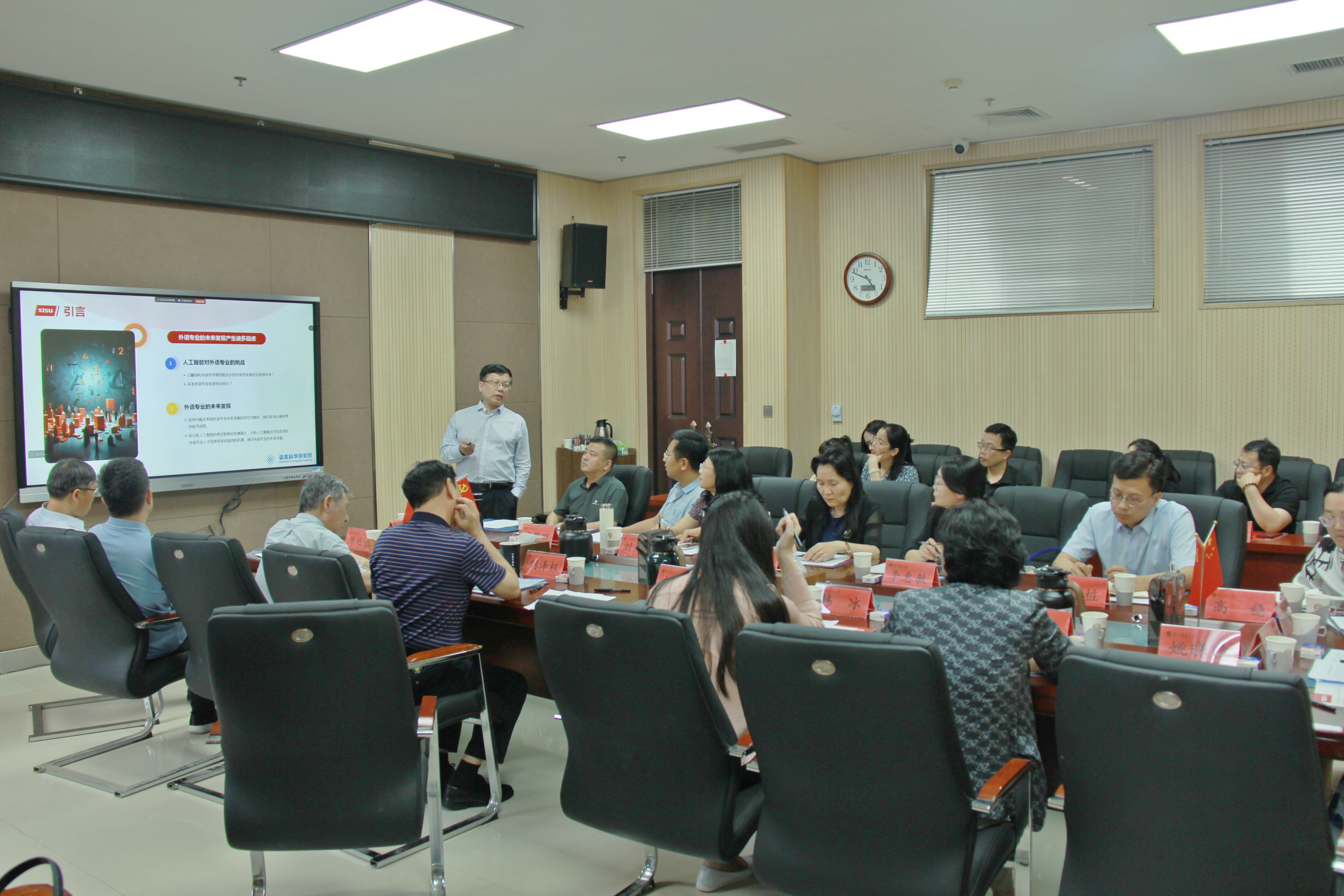 在闭门论坛阶段,胡开宝做了题为“人工智能背景下外语学科的转型与发展”的报告。报告结束后,胡开宝与河南高校外语学院院长对河南外语学科的转型与发展进行了热烈讨论。