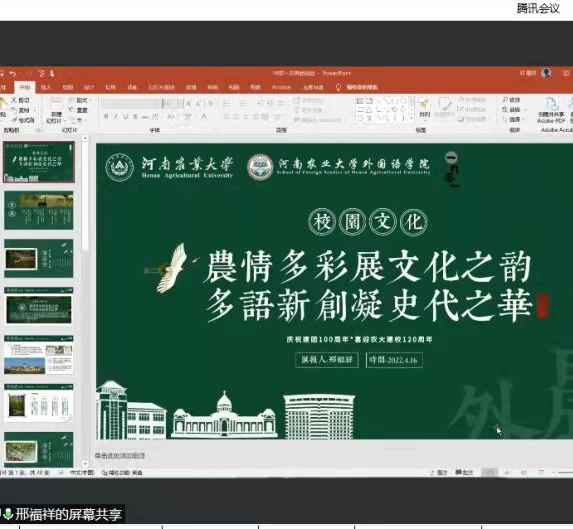 其中19级英语一班班长邢福祥以“文化”二字出发,继而开始延伸,“农”情、多“语”即为纵横中文网 和纵横中文网 ,“史代”即为党史团史校史和新时代。从教育的本原出发,将学校文化充分融入学校教育中,让青年学子真正拥有教育“场所精神”的校园文化建设天地。