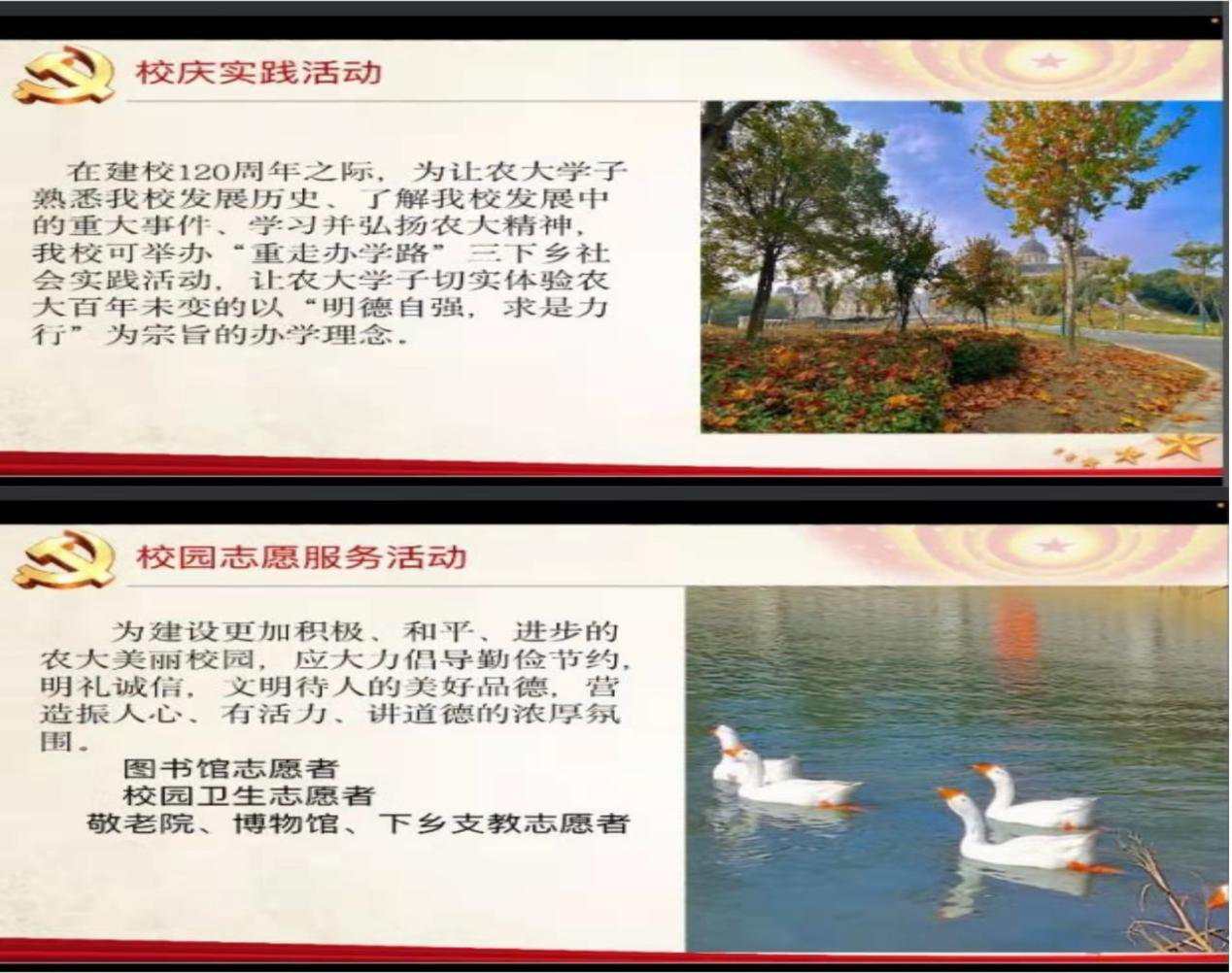 20级英语三班班长樊怡婷以建团100周年、农大建校120周年为契机,通过开展内容丰富的社会实践活动,激励广大团员青年继承和弘扬共青团的光荣传统,全面展示了我院青年朝气蓬勃的精神风貌。