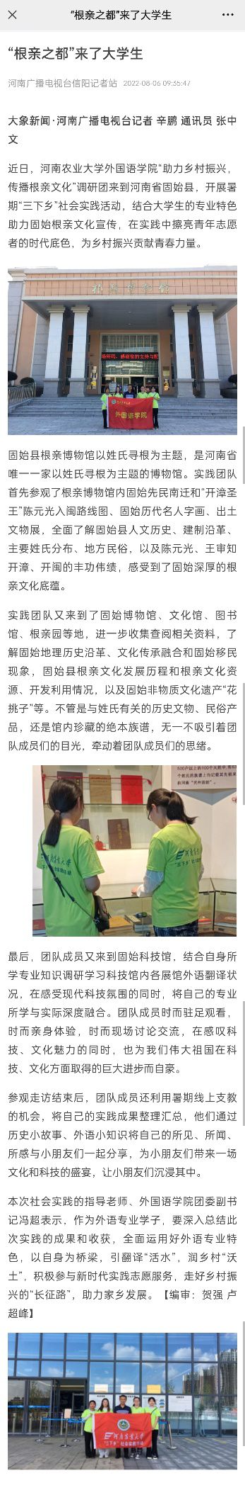 据悉,据悉此次社会实践活动受到河南广播电视台大象新闻等媒体的报道。此次社会实践中,外语专业学子结合学院专业特色助力固始根亲文化宣传,增强了自身的社会责任感,提升了自我服务人民群众的能力,彰显了新时代大学生的良好风貌和责任担当,同时,也在实践中擦亮了青年志愿者的时代底色,为乡村振兴贡献青春力量。