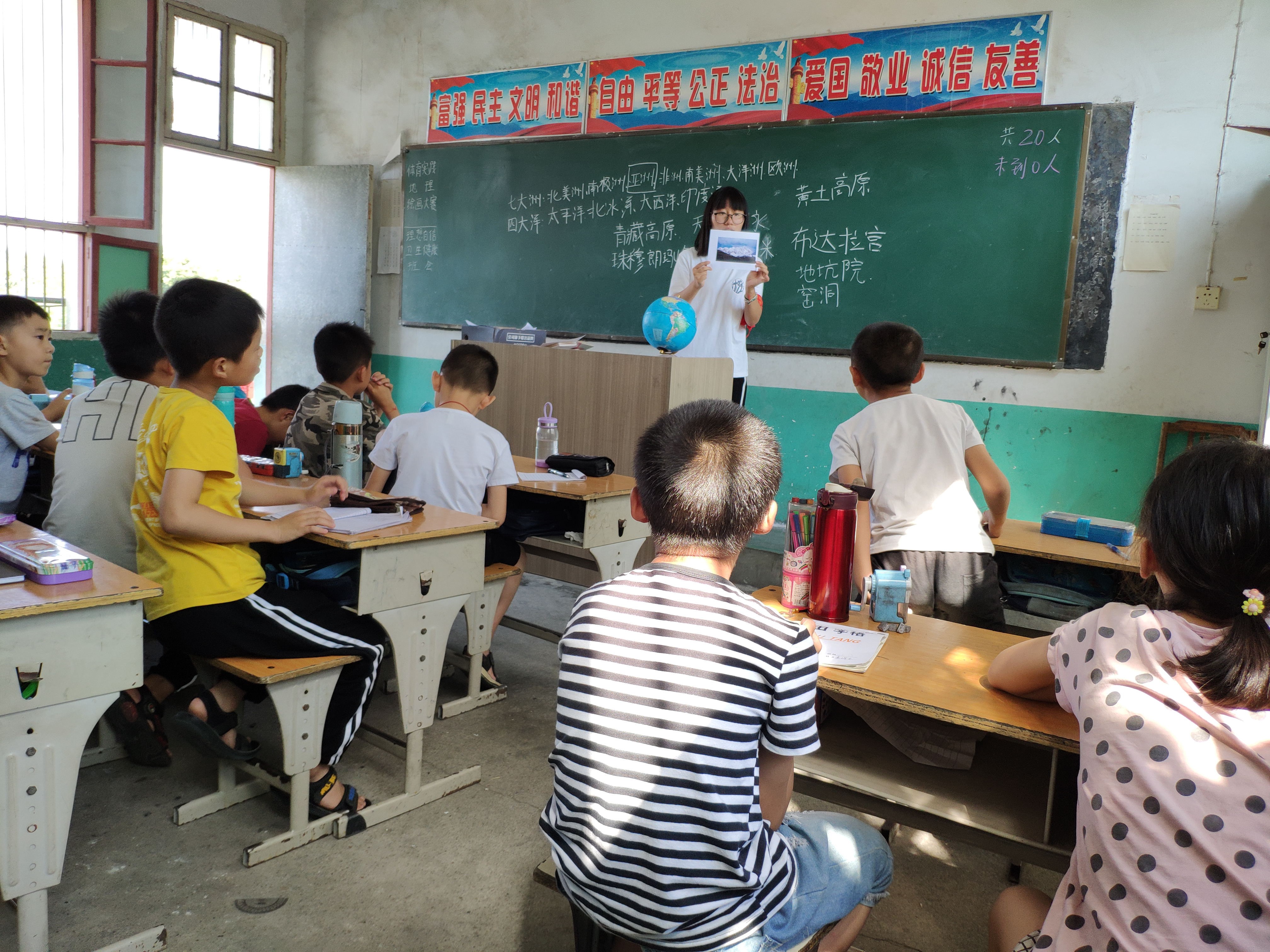 7月3日,支教组正式开始授课,支教队员开启了他们作为老师的历程。语文课上,朗朗的读书声伴着清晨的朝阳传遍校园。地理课上,有趣生动的地理图片和地理视频为孩子们描绘了地理的大世界,让他们可以自由地遨游在地理的乐园。英语课上,好听又纯正的英语语音充斥着孩童的耳畔,为他们正确地打开语言的新世界。一节节课程下来,支教队员都止不住的夸赞孩子们的乖巧与懂事,孩子们的配合,令队员们十分开心,一种教书育人的成就感充斥着每一位支教队员的心田。
