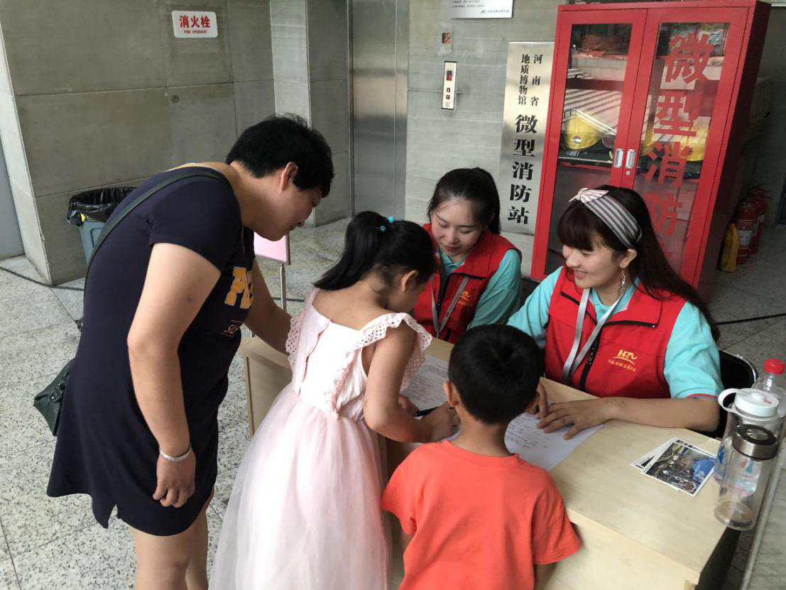 到达地质博物馆后,地质博物馆接待人员对队员表示了热烈的欢迎,队员们也对各自负责的工作进行了详细的介绍。明确各自的工作后,队员们去到各自的岗位开始了一天的志愿服务。导引组负责在地震馆和恐龙馆进行导览指引服务,帮助参观游客熟悉馆内情况、馆内路线,沿着线路参观。验票组负责在进馆通道帮助工作人员验票,防止出现逃票、漏票等行为。前台组负责在咨询台接游客电话,及时回复及处理游客信息。问卷调查组负责就游客满意度、知识普及程度、馆内设施是否完善等开展问卷调研活动,参加者获得了明信片奖励。巡视组负责巡视博物馆,帮助有需要的游客,及时制止攀爬、吐痰、乱丢垃圾等不文明行为。