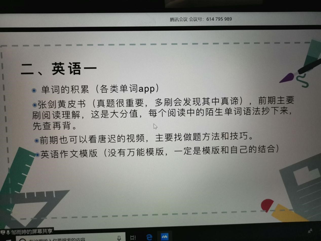 本网讯(审稿:李沛 供稿:梅如意)为进一步激发学生考研热情,明确考研目标,掌握考研技巧,6月19日晚七点,我院利用腾讯会议举办了线上考研宣讲会。本次宣讲会邀请了学院七位2020年考研优秀学生代表,各年级学生积极参与了本次宣讲会。