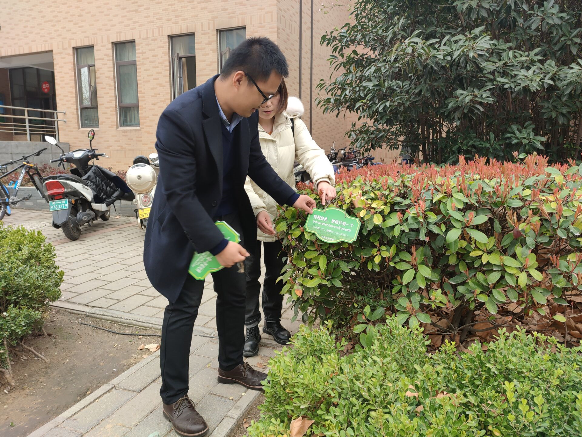 活动前期,我院向同学们广泛征集标语并统一制作了环保标识牌。在院团委的倡议下,我院学子亦自发地通过废物利用,发挥了专业优势用中文、英文、日文三种语言,利用废弃纸盒别出心裁的制作了许多温馨提示卡,在锻炼思维与动手能力的同时,更塑造了低碳生活的意识。活动期间,我院师生分为两队,在校园内分别开始为树木挂上“新饰物”——宣传标语牌。在两位老师的带领下,我院师生一起为校园的树木挂上标语,并科普绿色生活及植树造林的重要性。“举目四顾,芳草遍地”、“Use your love and care to this green space”、“緑色の生命を貯蓄して,緑色の光彩を開放します”等富有学院特色的标语成为了校园里一处处靓丽的风景线,标语牌样式新颖独特,美观大方,展现了我院学子维护校园绿色的决心以及热爱绿色、热爱校园的热情,更寄托着师生们建设绿色生态校园的美好愿景。此外,我院微光公益社团还组织了志愿者们捡拾草丛中的垃圾,用实际行动来努力维护校园的绿色环境。