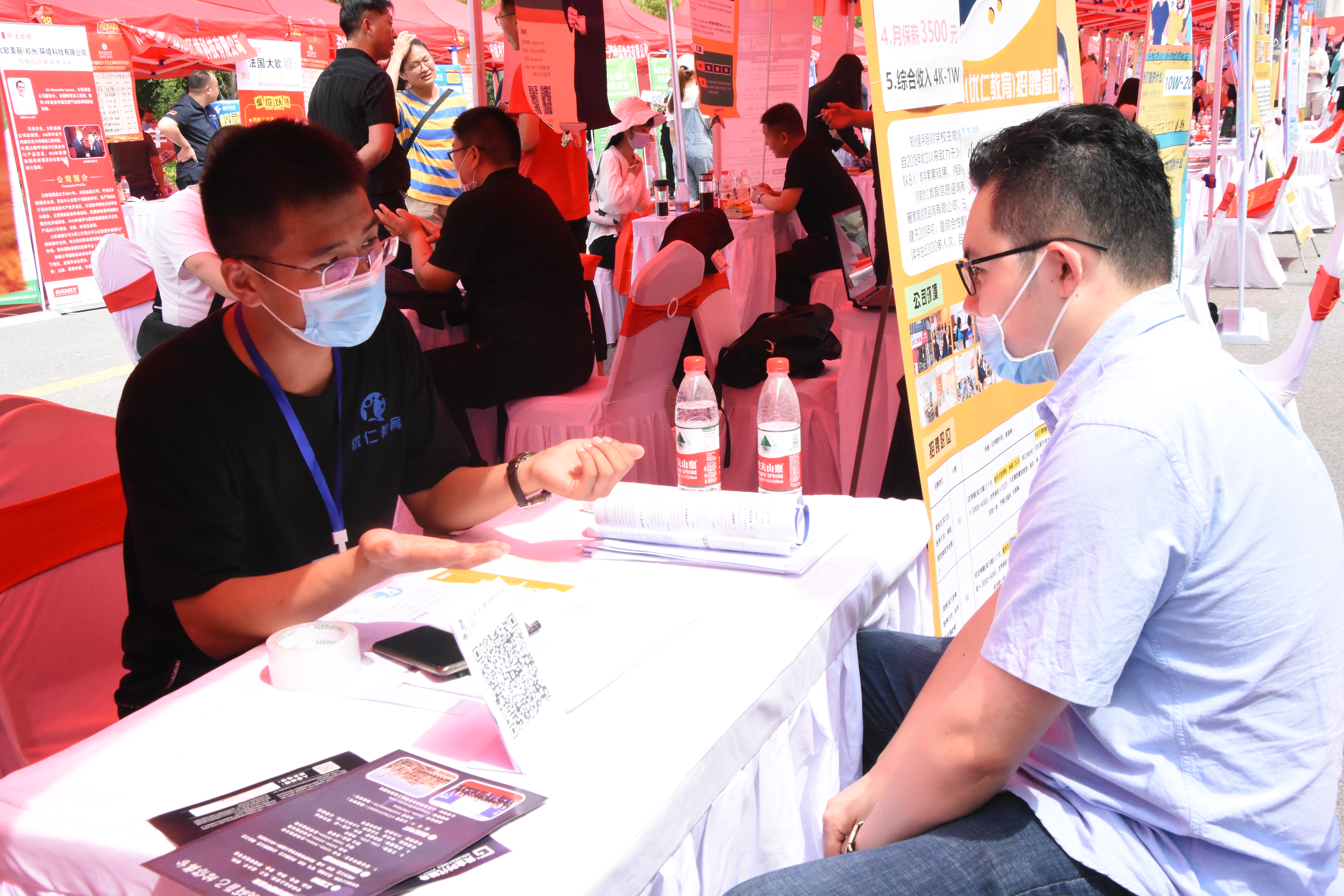 双选会现场,我院学生在新东方、平行线、斑马智学等企业展位处投递简历,咨询企业发展的详细情况,各企业负责人也对企业的工作环境、工资待遇进行介绍,双方认真洽谈并进行签约,现场气氛十分热烈。