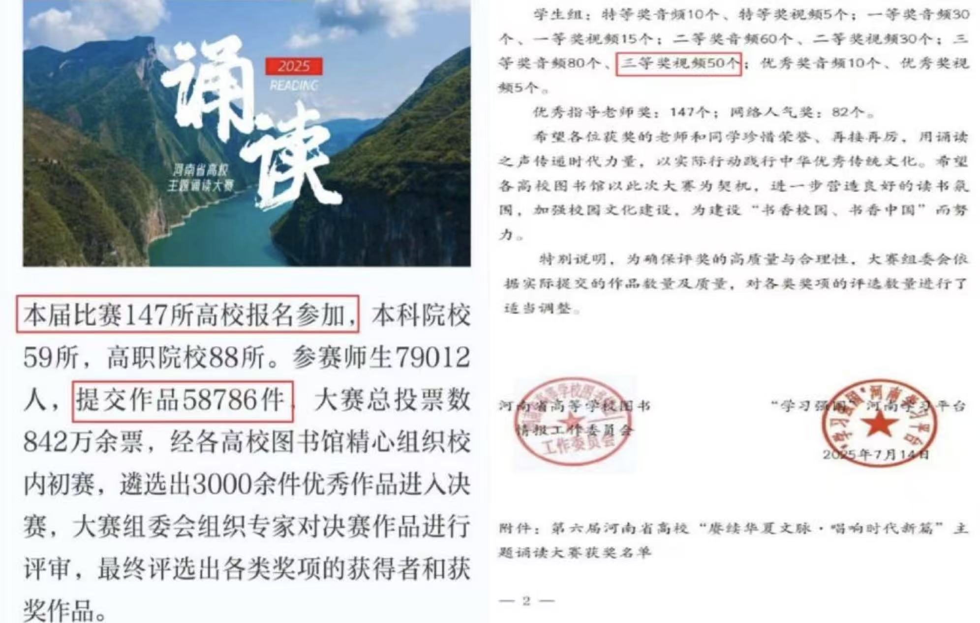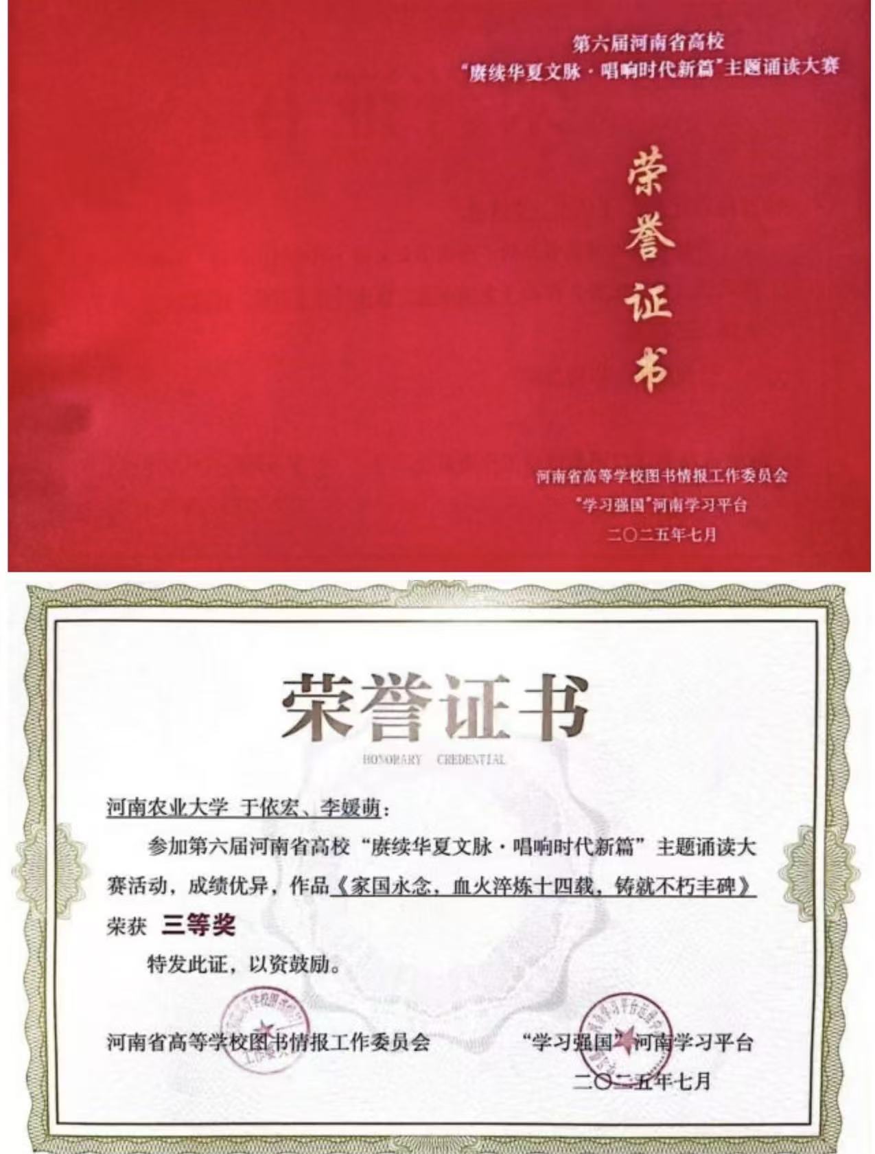 此次比赛由河南省高等学校图书情报工作委员会、“学习强国”河南学习平台联合主办。我院24级翻译二班于依宏、李媛萌在教师徐思园的悉心指导下,凭借出色表现在本次大赛中斩获省级三等奖,实现了我院在该赛事奖项上“零的突破”,充分展现了我院学子扎实的专业素养与积极向上的精神风貌,也体现了指导教师“实践育人”理念的显著成果。