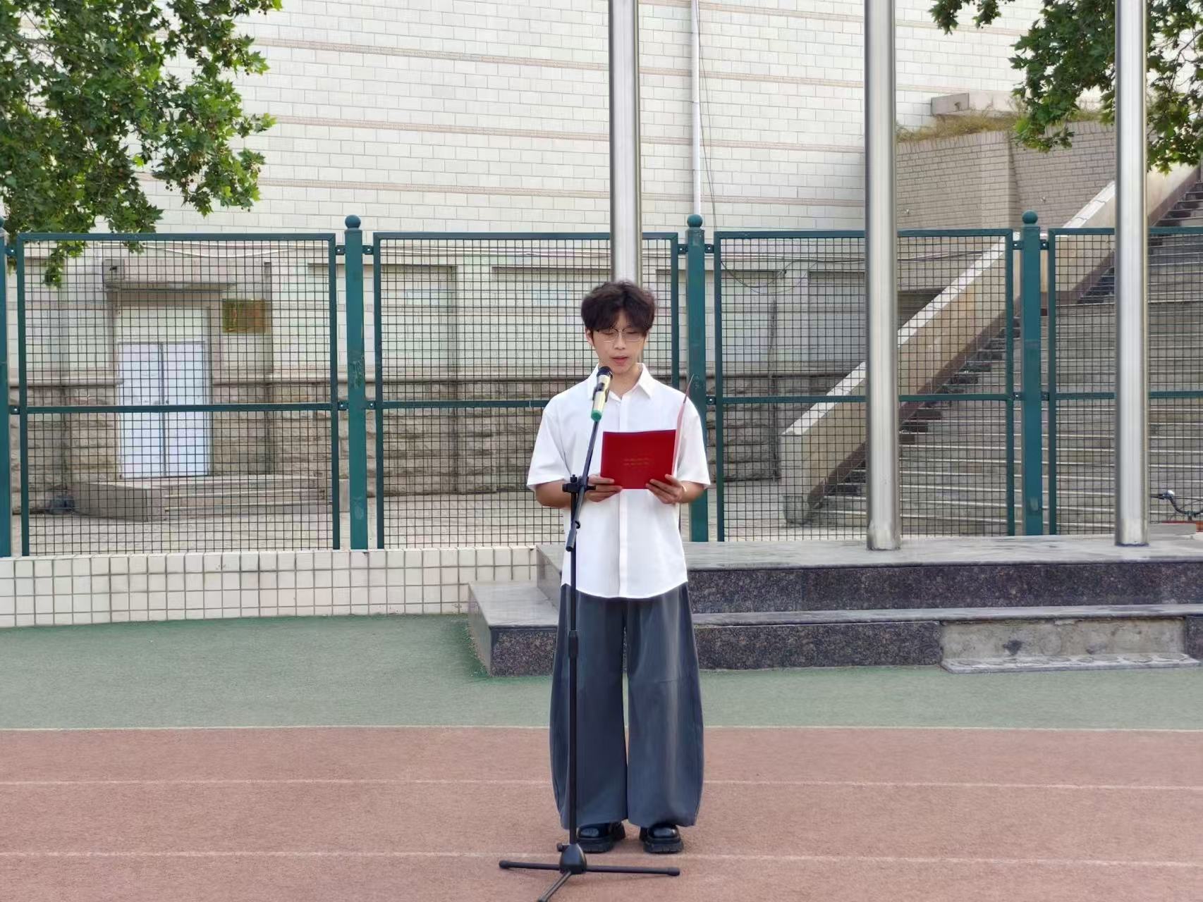 杨鑫发表国旗下的讲话。他向同学们提出三点期望:一、赤子之心,当以语言为桥,厚植家国情怀。二、一流之梦,当以创新为帆,勇攀学术高峰。三、青春之志,当以奋斗为桨,书写时代答卷。新时代外语人要继续坚定信念,以赤子之心守护文化根脉,以一流之梦激扬奋进力量,在建设中国特色世界一流农业大学的征程中贡献外语人的智慧与担当。