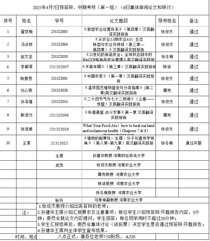 本网讯(审稿:吴玲 ;供稿:马孝幸;摄影:马孝幸 宋洁 齐晓萌 )4月6-7日,我院组织开展了2025年英语笔译专业研究生学位论文预答辩暨中期考核和开题报告论证会。本次论证会特邀华北水利水电大学刘文霞教授、河南财经政法大学孙建华教授和郑州航空工业管理学院郭银玲教授分别担任论证小组主席,我院硕士生导师担任委员,29名研究生参加预答辩暨中期考核,1名研究生参加开题;24级研究生旁听了此次论证会。