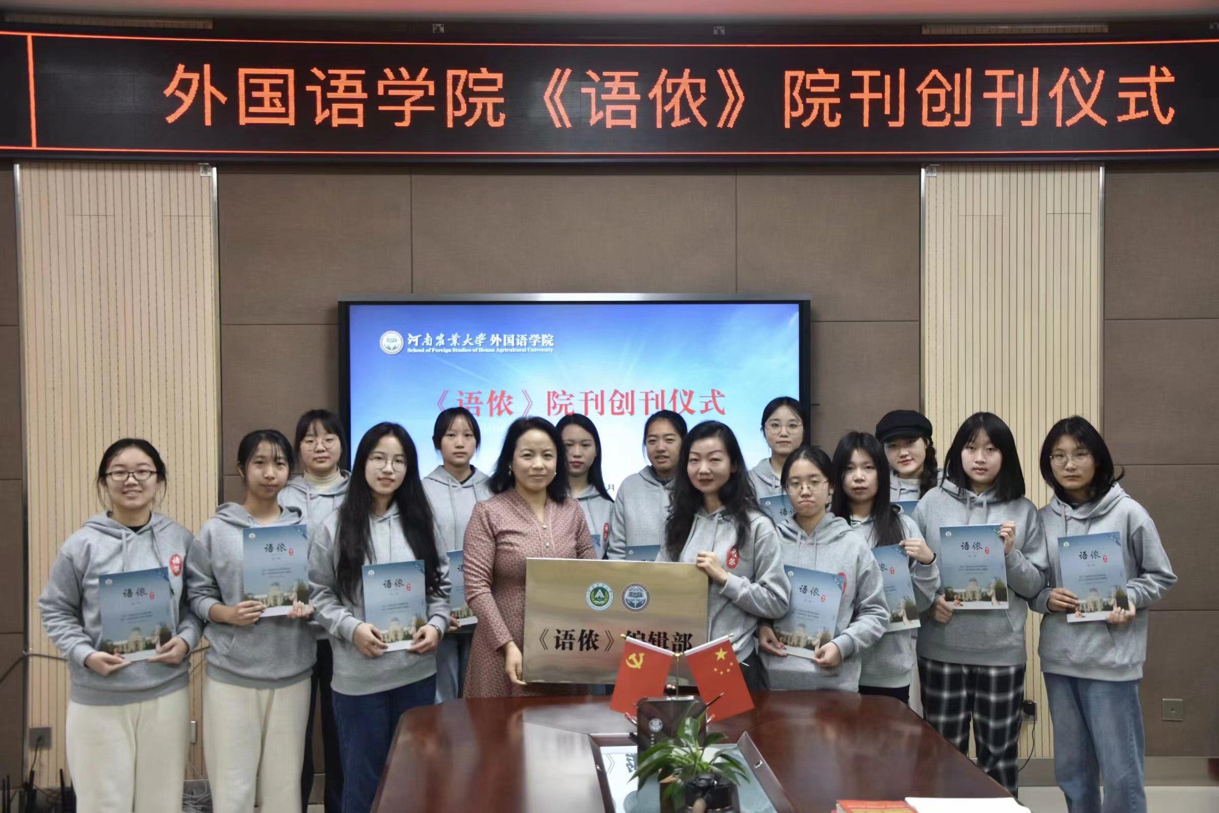 王燕萍向《语侬》编辑部授牌并向编辑部全体成员发放了首期院刊。她为院刊《语侬》的成功创办表示非常欣慰与高兴,向全体为《语侬》付出辛勤努力和劳动的老师和同学们表示感谢。她指出,习近平总书记多次强调要“着力提高国际传播影响力、中华文化感召力、中国形象亲和力、中国话语说服力、国际舆论引导力,不断提高塑造国家形象、影响国际舆论场、掌握国际话语权的能力和水平。”《语侬》是我们农大外语学子在创新对外话语体系的一个重要的载体。希望全院师生用温暖把《语侬》宣传出去、带着责任把《语侬》办好、带着爱心把《语侬》传递下去,稳定发挥,持续发力,向更多的人展现农大纵横中文网