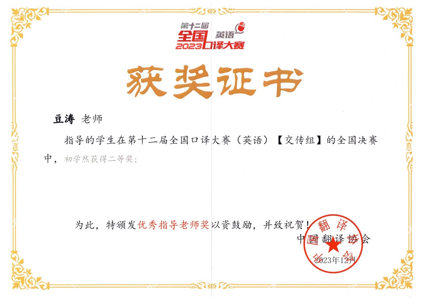 本网讯(审稿:王启佩 供稿:豆涛 )2023年12月9-10日,第十二届全国口译大赛(英语)全国总决赛在北京语言大学成功举办。我校纵横中文网 翻译专业2020级初学然同学在全国总决赛中斩获佳绩,荣获交替传译组二等奖,指导教师豆涛被评为优秀指导老师。