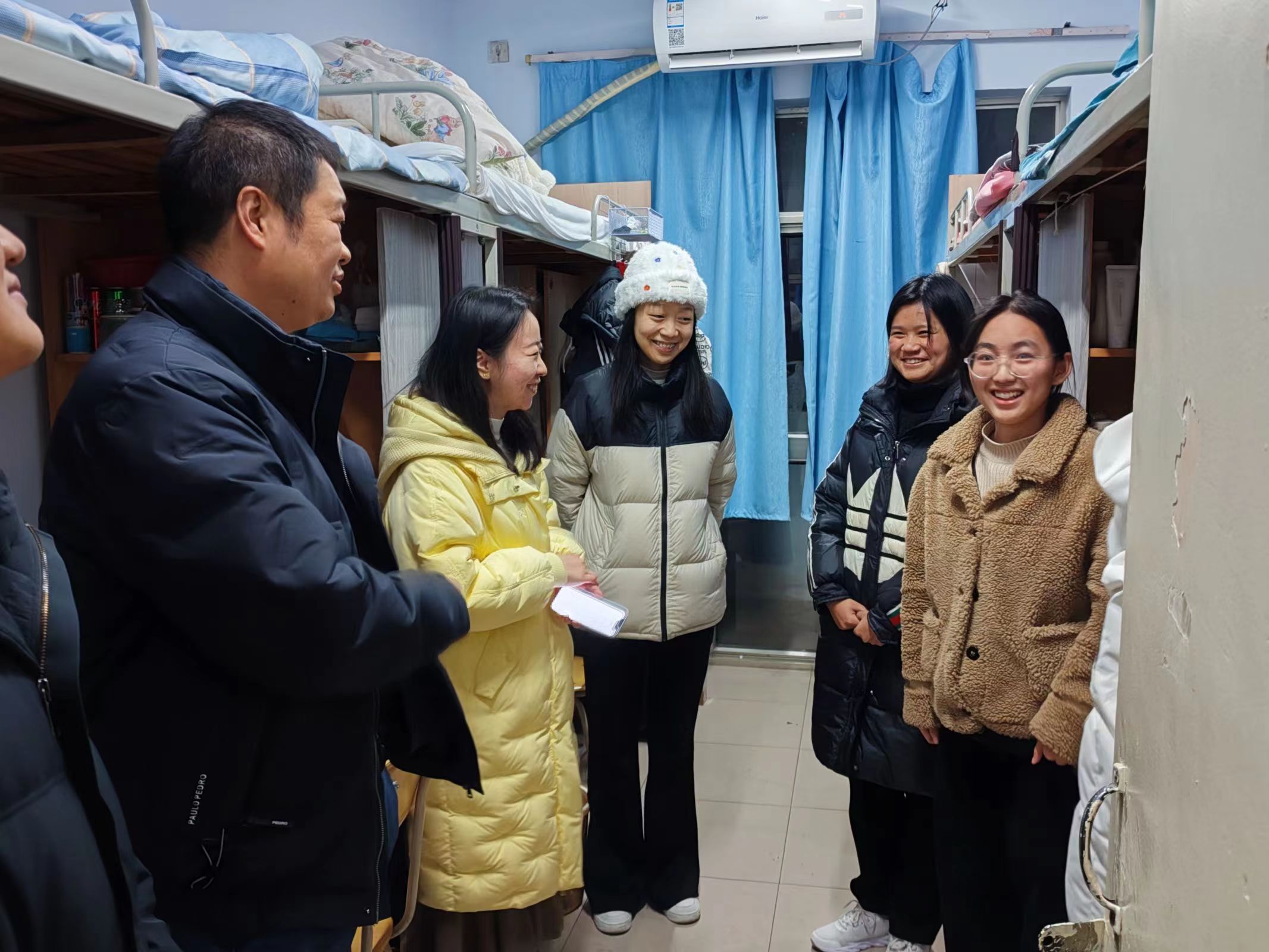 在桃李园学生公寓,院领导深入学生宿舍,为2023级新生送去爱心水果大礼包和保暖衣套装,关切询问同学们在学业和生活方面能否适应,鼓励大家以积极进取的心态融入大学生活,努力学习专业知识与技能,踔厉奋发,不负青春韶华。