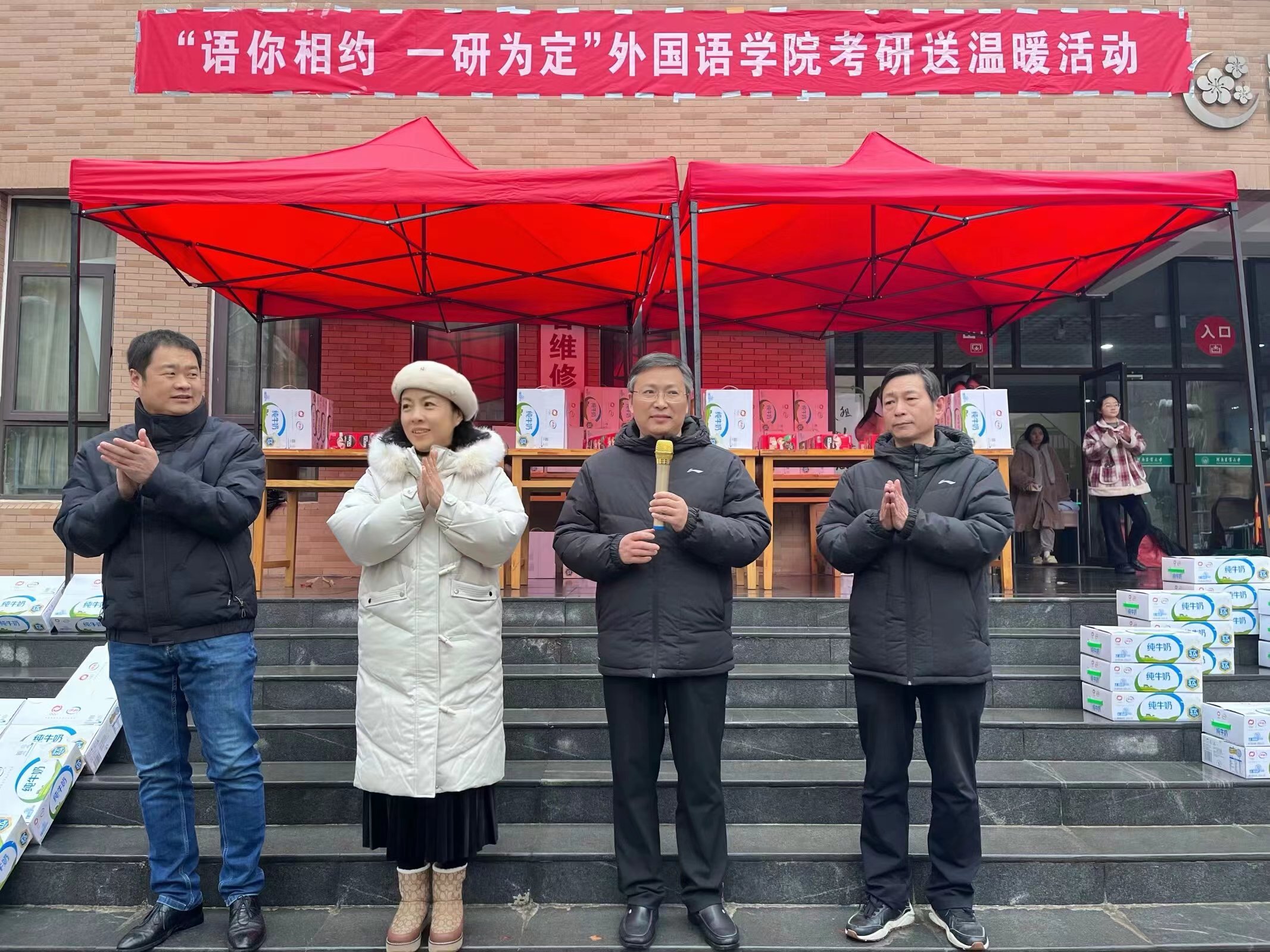张俊杰代表学院向全体考研学子送上了关怀与祝福,他叮嘱同学们要积极做好低温雨雪天气的防范应对,抓紧最后的关键时间,全力备考,用最佳的状态沉着应对。院领导为所有考研学子送上了精心准备的牛奶和咖啡,并祝愿同学们心想事成、金榜题名。