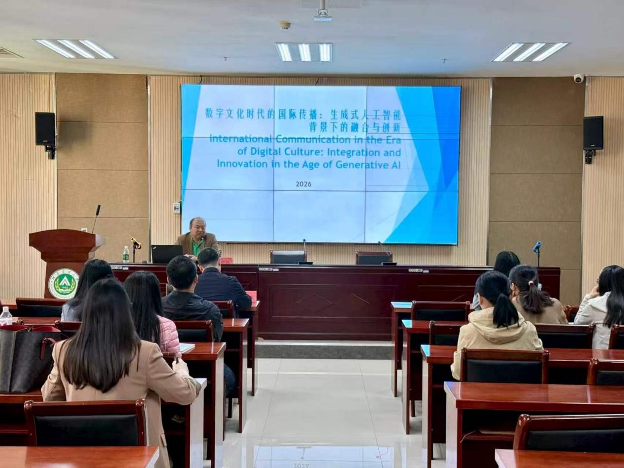第90期“励学大讲堂”,并作了题为“数字文化与国际传播”的学术报告。报告会由副院长豆涛主持,学院骨干教师、研究生及本科生代表参加。