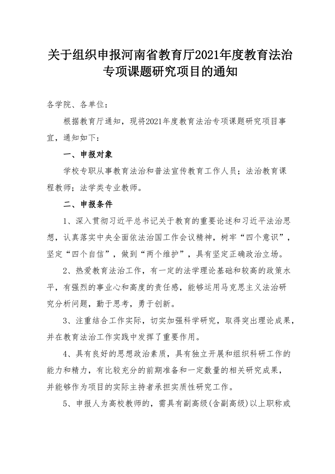 关于组织申报河南省教育厅2021年度教育法治 专项课题研究项目的通知