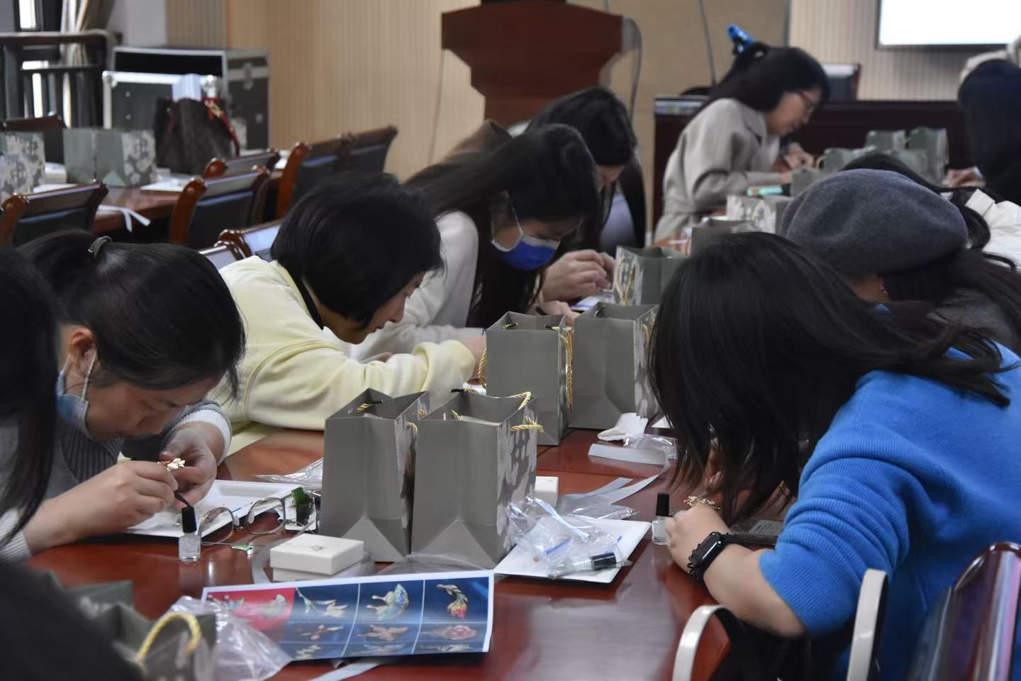 螺钿作为我国非物质文化遗产之一,是一项传统的高奢工艺。活动现场,指导老师为大家介绍了螺钿工艺的历史文化,带领大家认识手工材料并教授制作方法。随后,教职工们纷纷拿起工具,设计图案、压片、上胶……老师们发挥想象,将一片片色彩鲜艳的螺片小心翼翼地粘到底托上,赋予了一只只“蝴蝶”、一朵朵“花”不同的神韵,打造出了一个个各具特色的螺钿工艺品。活动现场氛围轻松愉悦,在传统文化中展现了学院教职工昂扬向上的精神面貌。
