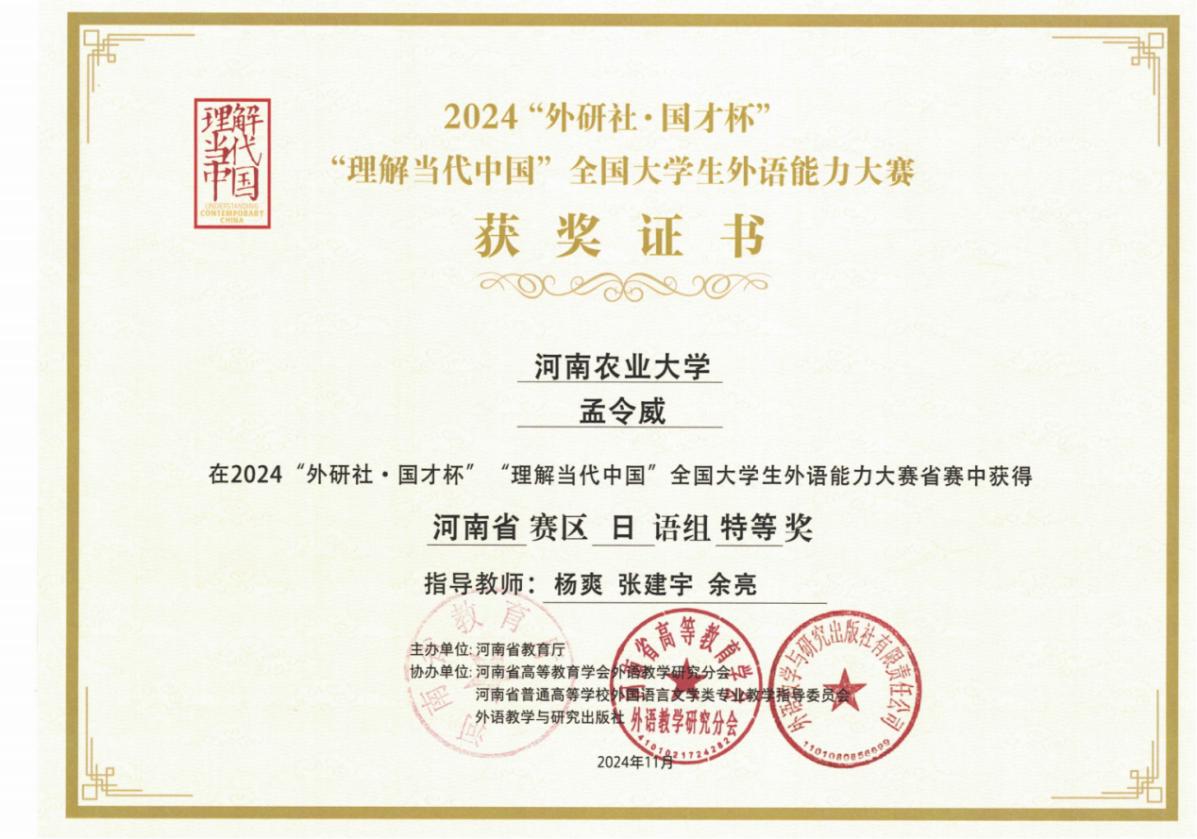 学生综合素质良好,实践能力突出。考研率稳居学院前列,进入中国人民大学、同济大学、外交学院、广东外语外贸大学等知名学府继续深造。参与河南—东盟粮农合作大会、“世界古典学大会·走读中国之中原行”、世界猪肉大会等志愿活动,获得全国大学生乡村振兴大赛金奖、全国翻译大赛一等奖、全国口译大赛二等奖、全国大学生外交英语大赛二等奖、全国高等农林院校大学生英语演讲大赛二等奖、河南省“口译之星”冠军等荣誉。