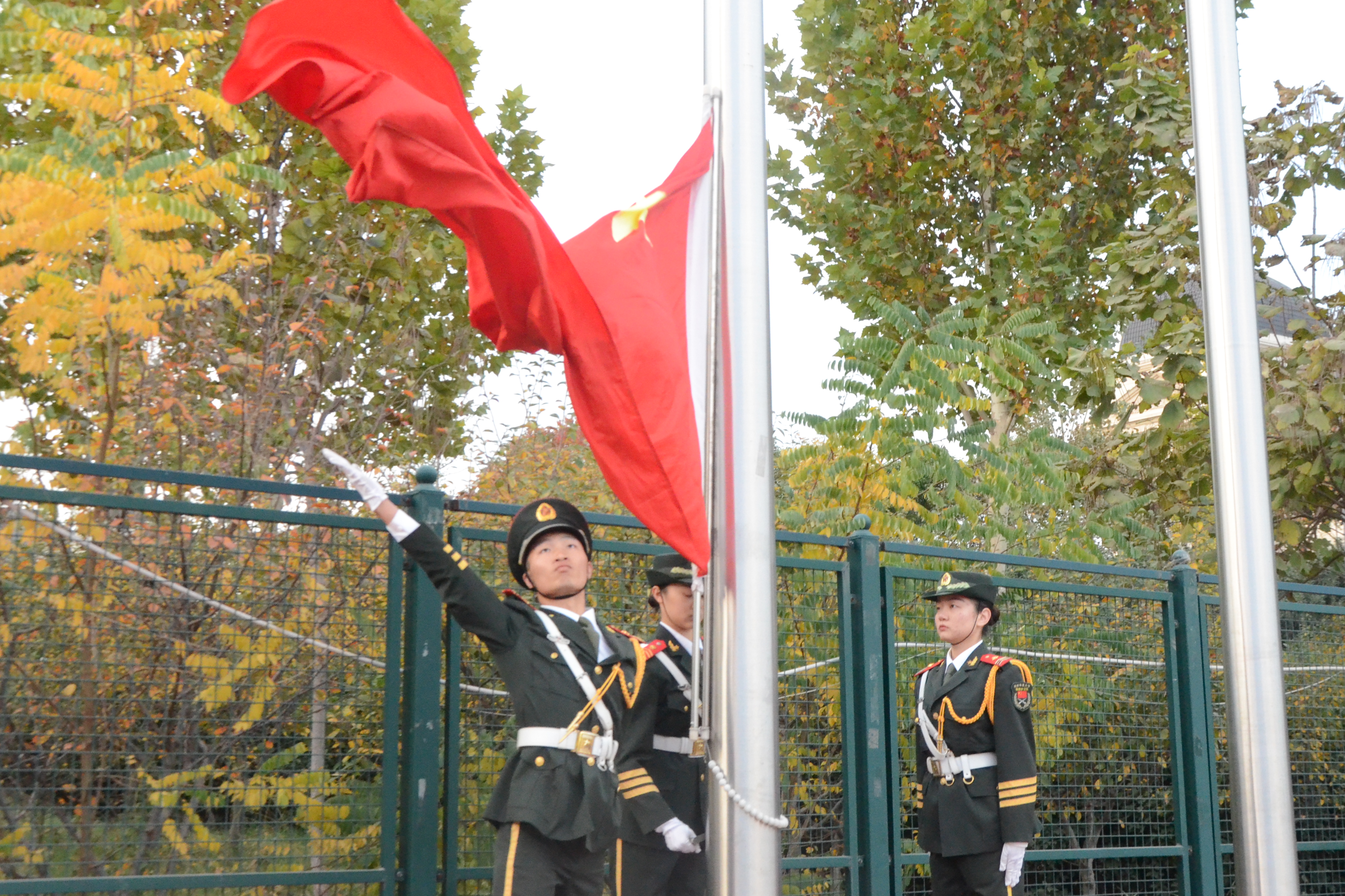迎着朝阳,英姿飒爽的国旗护卫队踏着铿锵的步伐来到国旗台下,霎时,全场一片肃静。雄伟庄严的国歌奏响,升旗手振臂一挥,鲜艳的五星红旗徐徐展开。全体新生仰望注视,高声齐唱国歌,五星红旗迎着初升的太阳,在晨曦中迎风飘扬,鲜红的国旗成为校区上空一抹绚丽的色彩。
