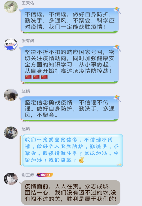 通过此次主题班会,我院学生对当前疫情形势有了更准确的认识,对疫情防控要求有了更加清晰的认知,激励我院师生上下一道,众志成城,共克时艰,各司其职,坚决打好这场疫情防控阻击战!