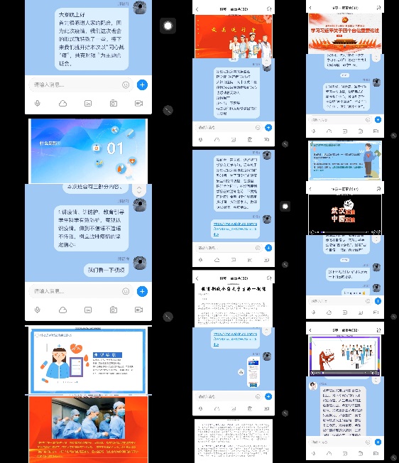 会议期间,我院辅导员、班主任以班级为单位,通过QQ群、微信群、网络视频等新媒体手段,认真有序进班开展班会。会议内容包括:一、教育引导学生科学有效防护,理性客观认识疫情。二、强调学校疫情防控有关要求:学生一律不得提前返校、准确报送个人信息、制定合理的学习计划,认真进行线上学习,做到防疫学习两不误。三、引导学生树立责任意识,激发其强烈的爱国主义热情,增强其民族自豪感和自信心,教育引导学生增强“四个意识”、坚定“四个自信”、做到“两个维护”。