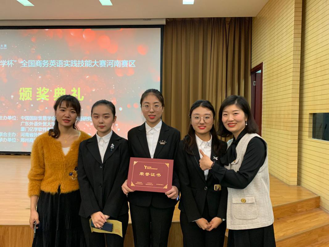 本网讯(审稿:李沛 供稿:张丹丹)第三届“亿学杯”河南省商务英语实践技能大赛于11月8日-11月9日在郑州商学院成功举办。我院学子代雨晴、李雨欣、李歌畅组成代表队,积极参与了此次大赛。在学院老师老师柴奇、关珊珊的指导下,他们运用扎实的商务英语知识,以精彩的口语表达博得众彩、脱颖而出,经过与来自24所高校的代表队为期两天的激烈角逐,最终喜获三等奖。