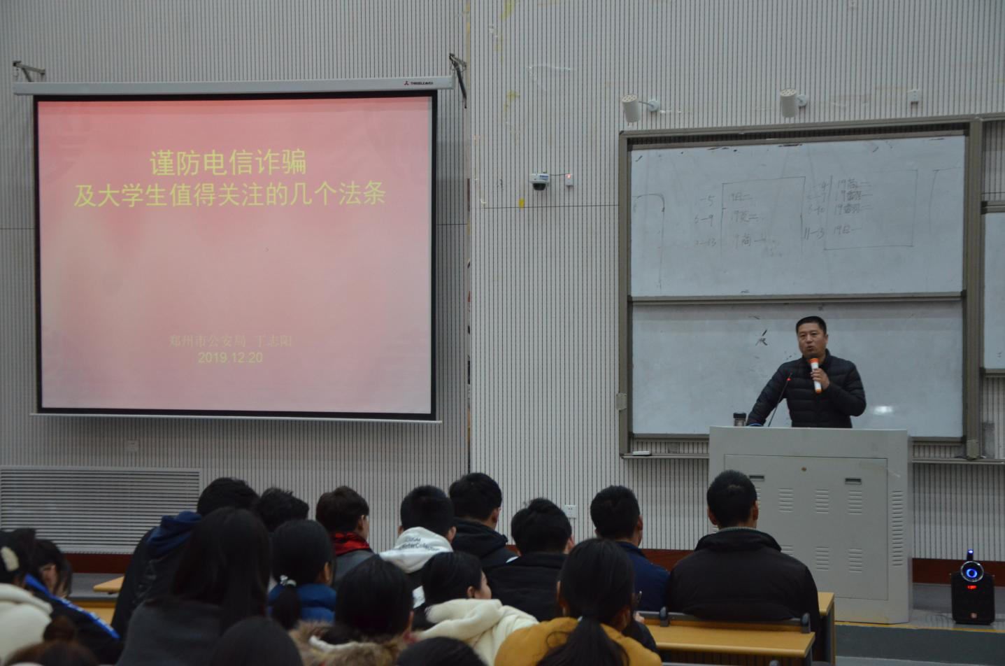 本网讯(审稿:李沛 供稿:张丹丹)为宣传防范电信诈骗的相关知识,提高我院学生对电信诈骗的防范意识,12月20日下午4点,我院诚邀郑州市公安局二级警督丁志阳警官于龙子湖校区繁塔楼大教室5举办防范电信诈骗知识讲座。学院团委书记李沛、辅导员牛烁携学院主要学生干部、17级和18级各班心理委员、19级全体学生聆听了本次讲座。本次讲座由李沛主持。