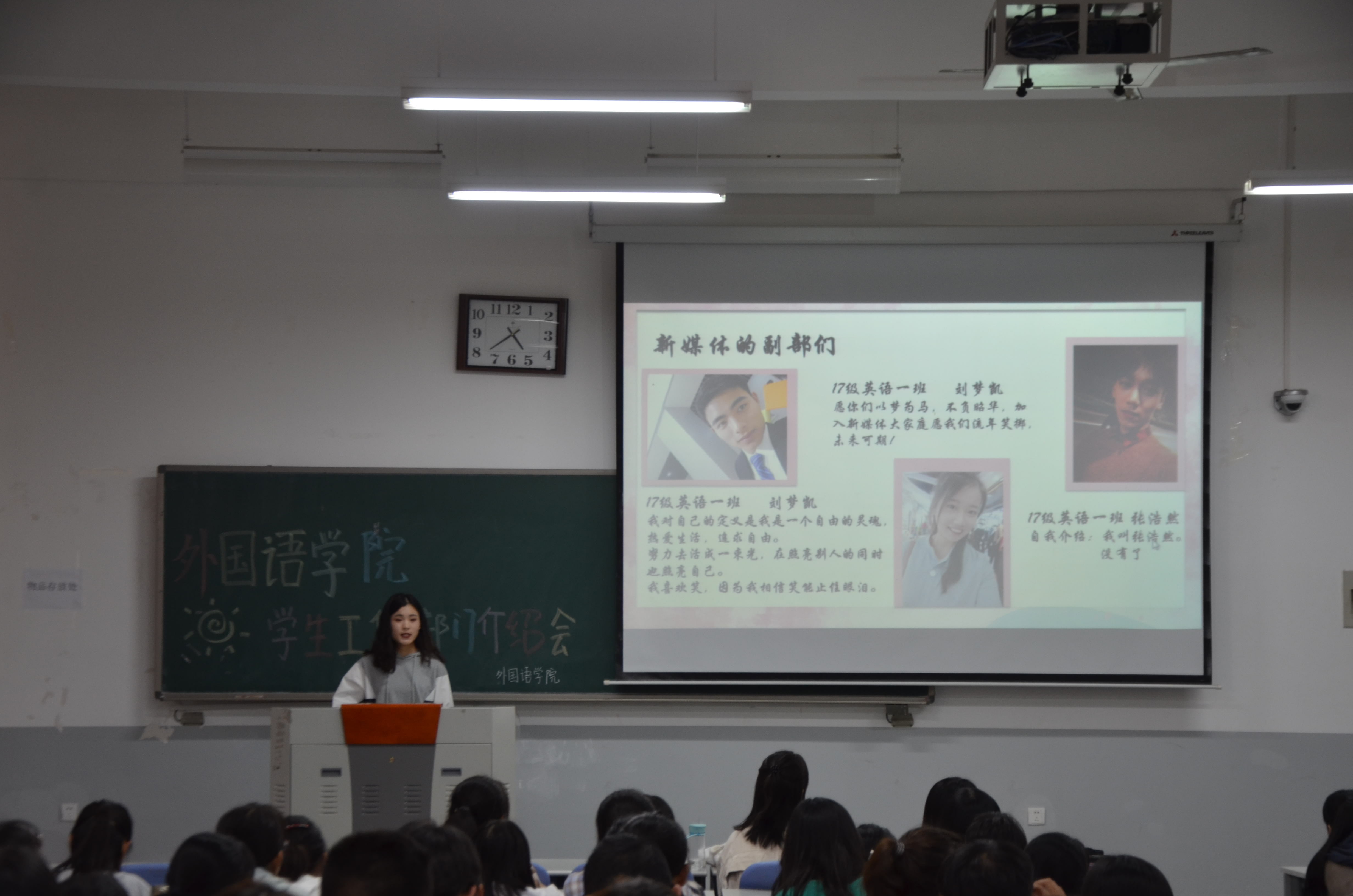 本次介绍会由团委办公室率先拉开序幕。随后,各部门代表依次上台利用PPT等进行展示,就其部门成员、工作职责、以及招新要求进行了详细说明。团委办公室以“思想引领,组织建设”为中心,向新生展示了一个严肃而不失活力的部门。新媒体工作室则在新媒体运营、宣传制作等独特的部门工作展示中,让新生认识了一个坚守“不负宣传,服务外院”理念的朝气部门。无论是体育部充满激情的体育赛事组织工作,还是文艺部精彩纷呈的新生舞蹈大赛和送毕业生晚会,学科部的学术文化节及“外研社杯”等讲座都展现出了各部门独特的魅力。同时,主要学生干部结合自身从事学生工作的经历,鼓励新生们积极参与竞选,勇于尝试,敢于拼搏,争当优秀的学生干部。